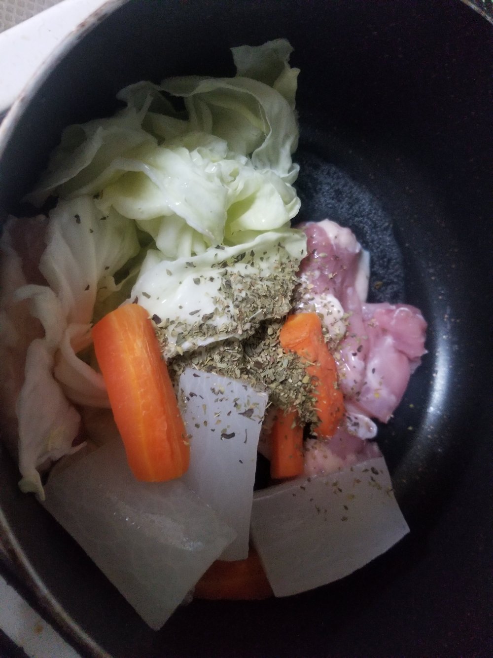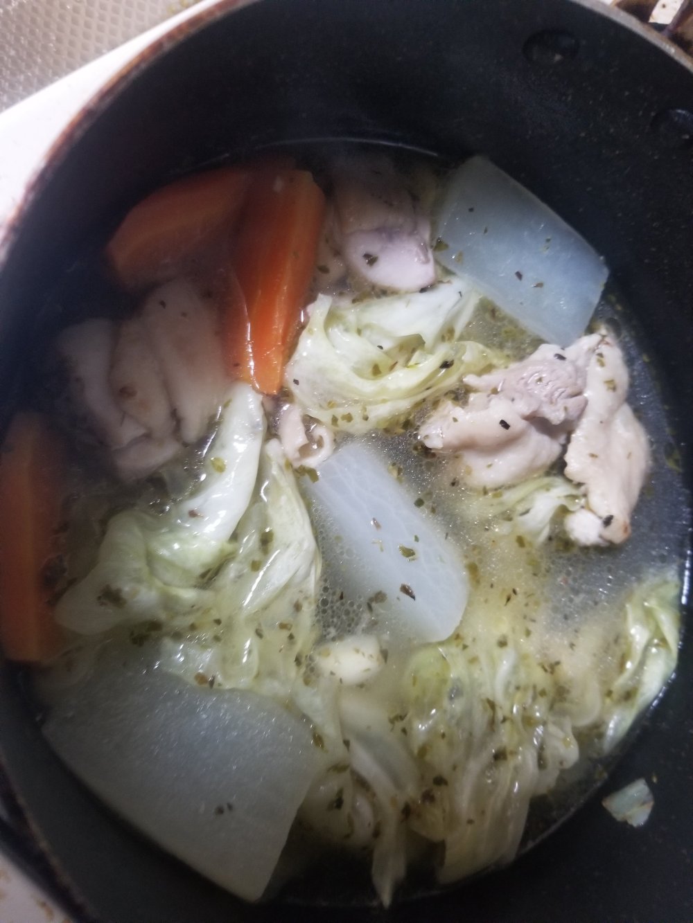 つぶしたにんにく、ざく切りのキャベツ、一口大にカットした鶏肉と加熱した大根、にんじんを炒めます。