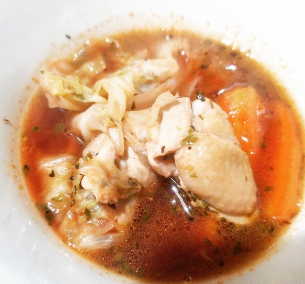 ■材料(1人分) ・鶏もも肉……1/2枚 ・大根……1/5本程度 ・にんじん……1/3本程度 ・キャベツ……2枚 ・にんにく……1片 ・だしとスパイスの魔法〈ボルシチ〉……1箱 ・バター……1片