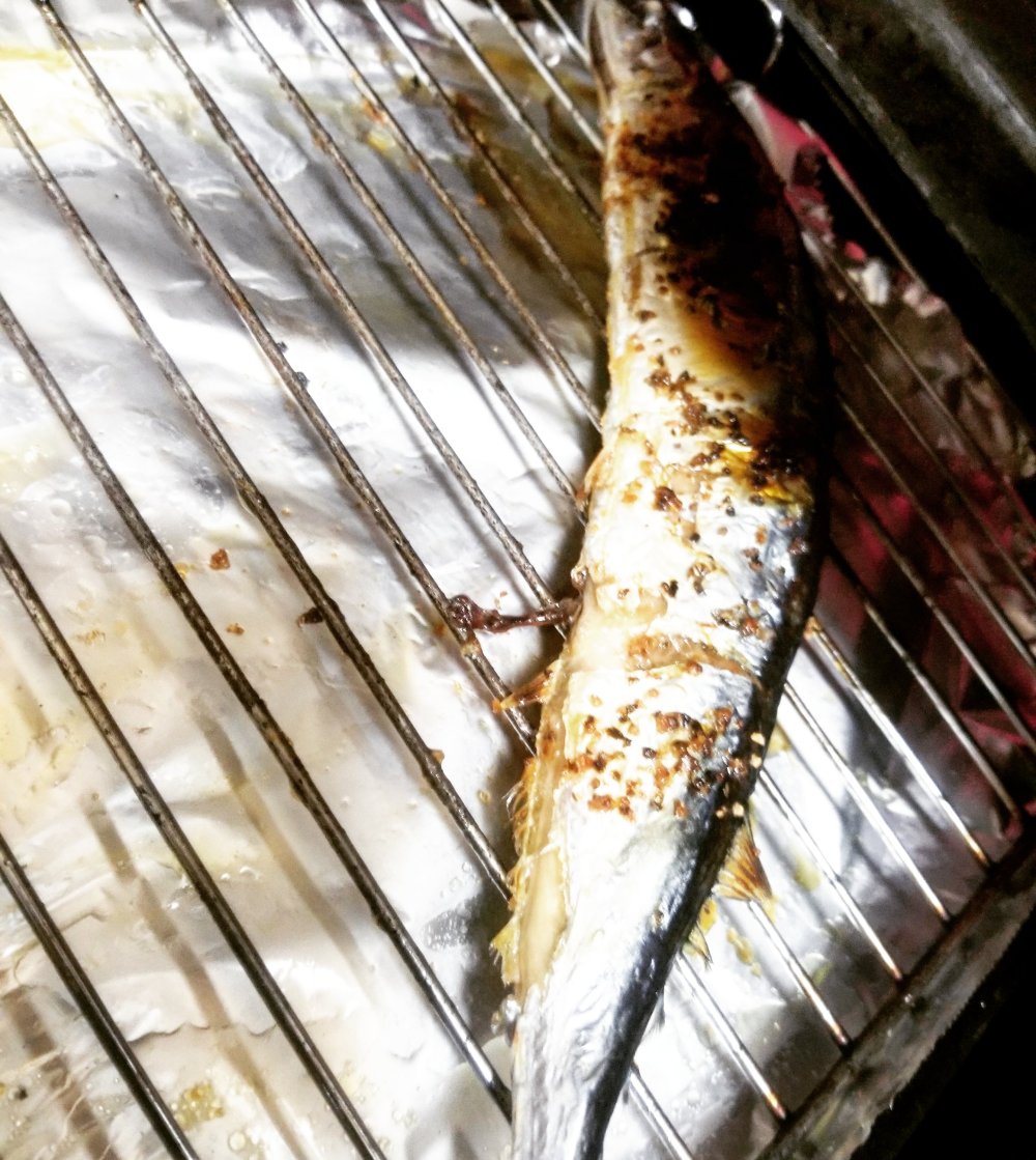 塩を振ったサンマは魚焼きグリルでじっくりと、皮に焼き色がついてぱりっとするまで焼きます。