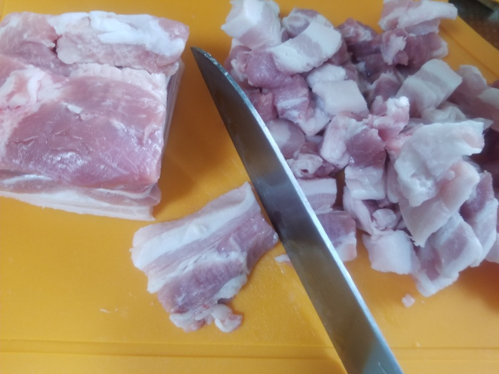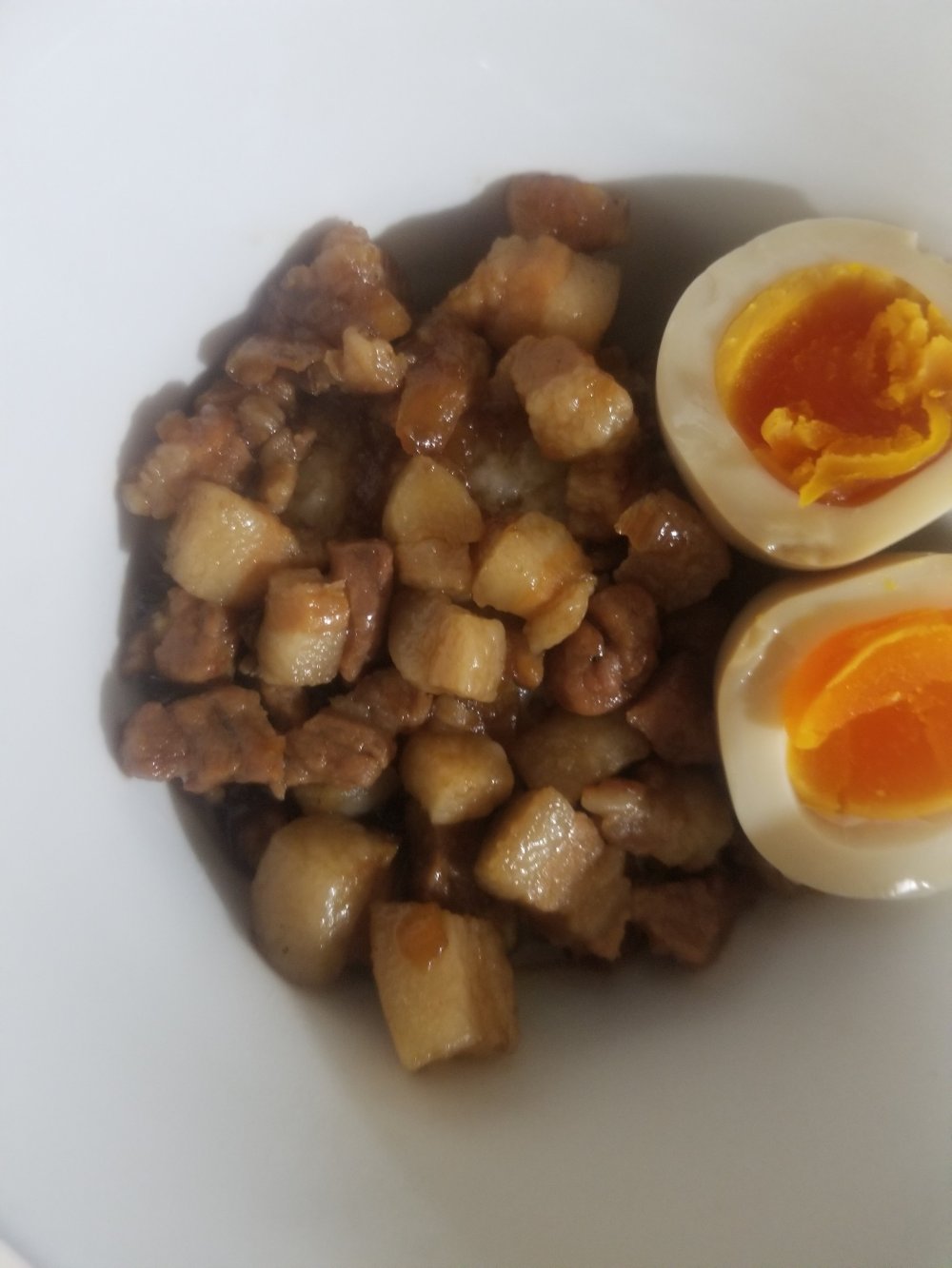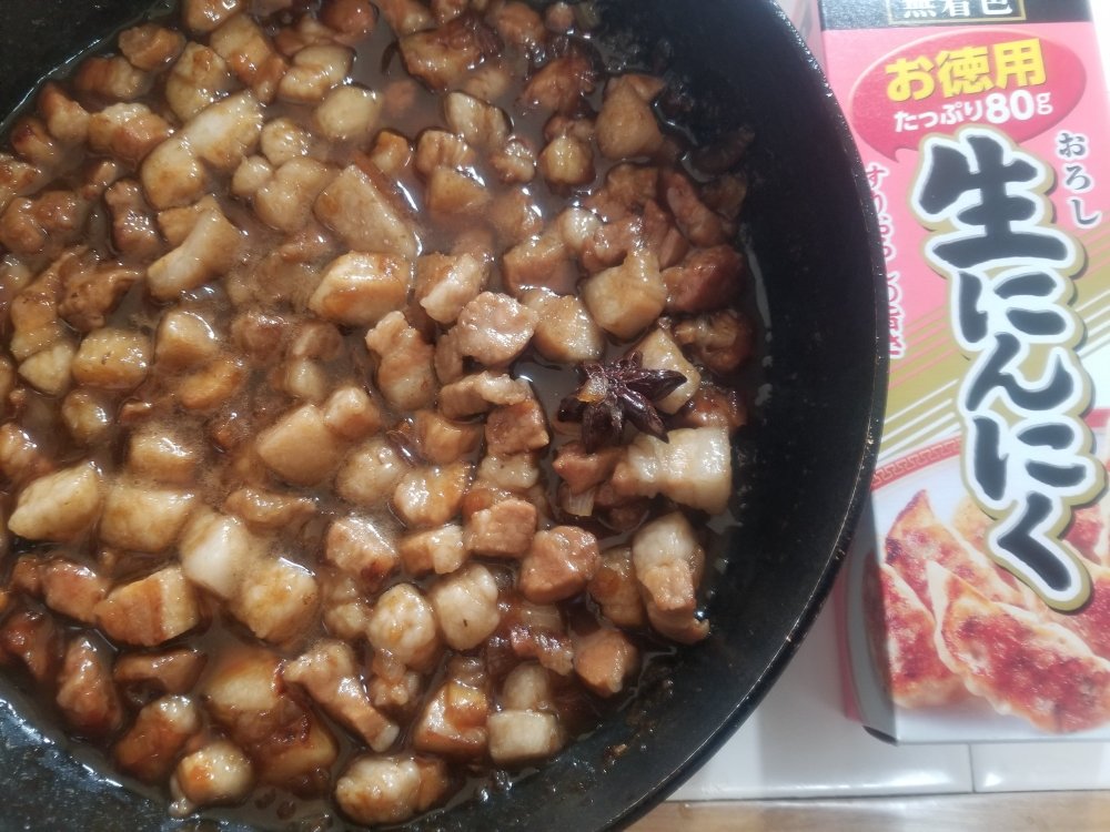 ■材料(2人分) ・豚バラブロック肉……300グラム程度 ・玉ねぎ……1/2個 ・しょうが……1片 ・ハウスおろし生にんにく……小匙1 ・酒……大匙1 ・醤油……1/2カップ ・みりん……1/2カップ ・水……1カップ ・砂糖……大匙2 ・八角(スターアニス)……2個 ・味付け玉子……2個(自家製にする場合のレシピはこちらで紹介しています) ・ご飯……1人当たりお茶碗1杯(量はお好みで)