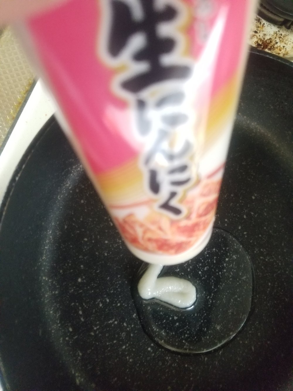 まずフライパンに「ハウスおろし生にんにく」を入れて、少し炒めます。