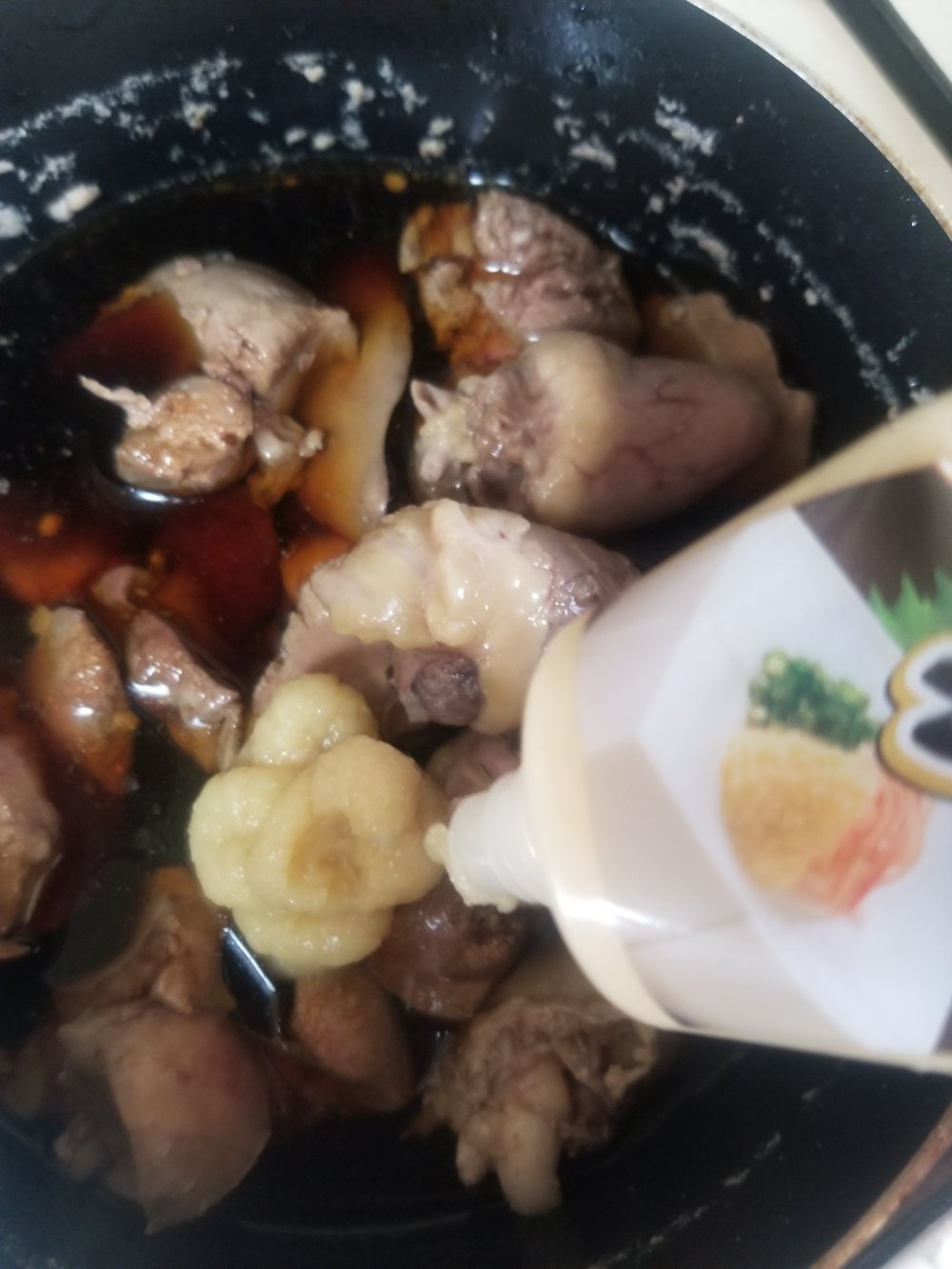 鶏レバーを鍋に戻し、麺つゆ、砂糖、残りのハウスおろし生しょうがを入れて火にかけます。