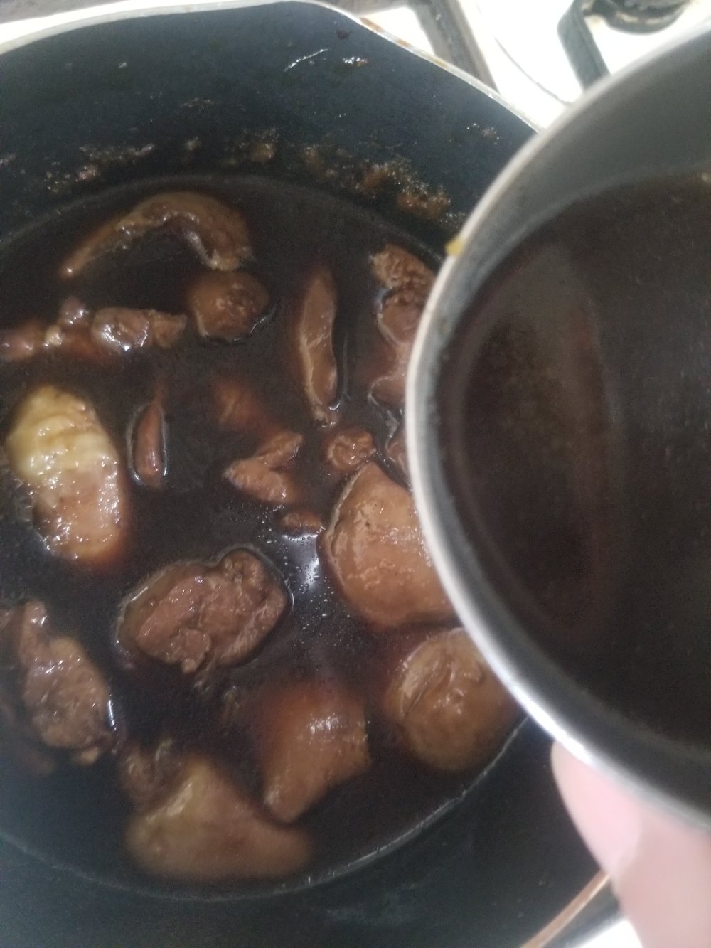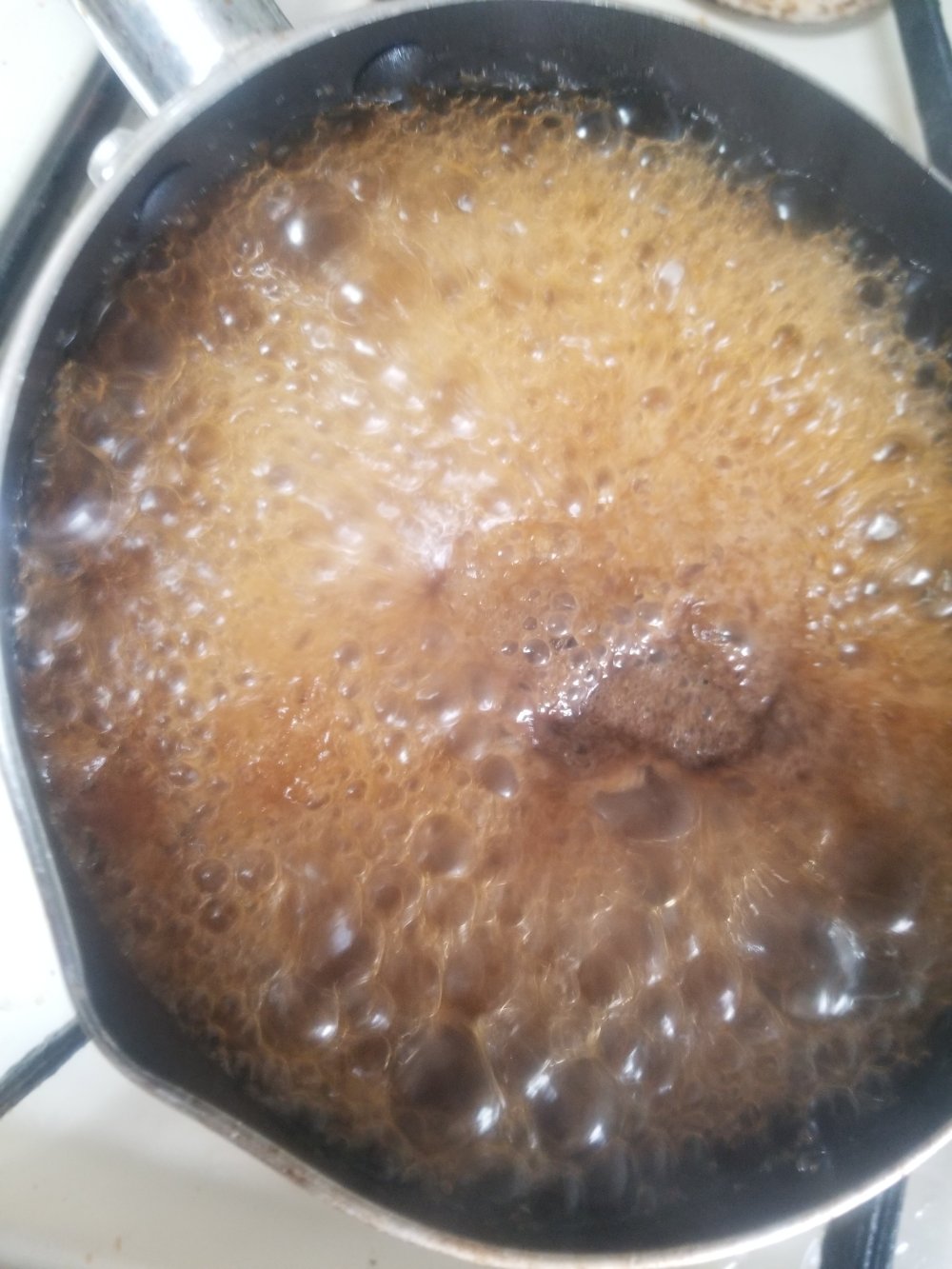 煮汁が半量くらいになったら、ウスターソースと酢を入れ、煮汁にとろみが出るまで煮詰めます。