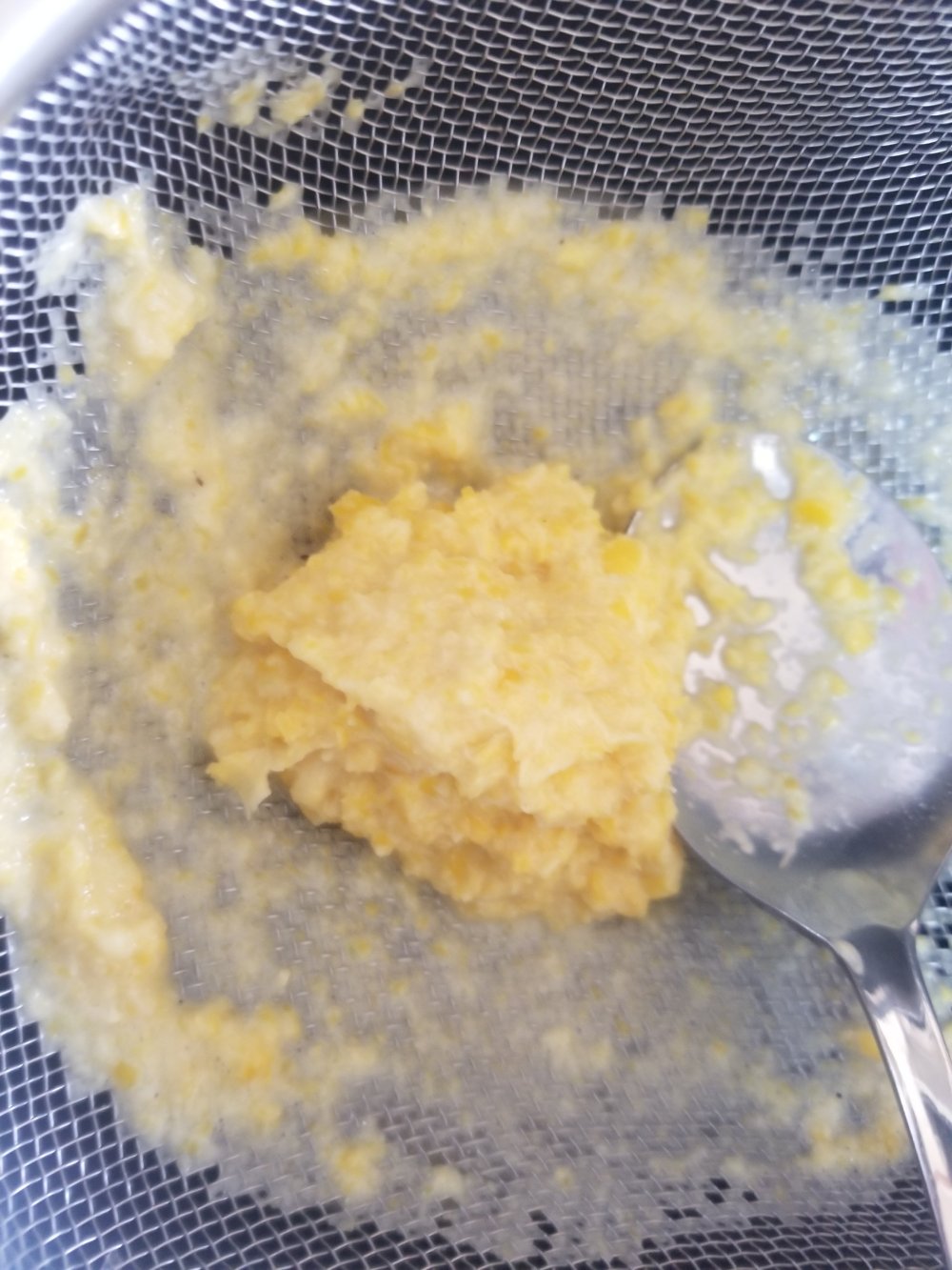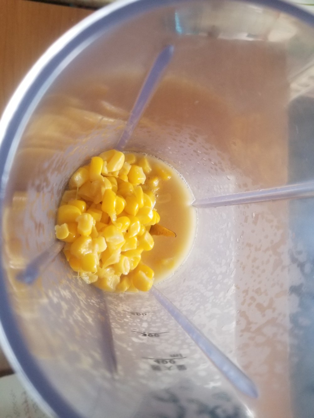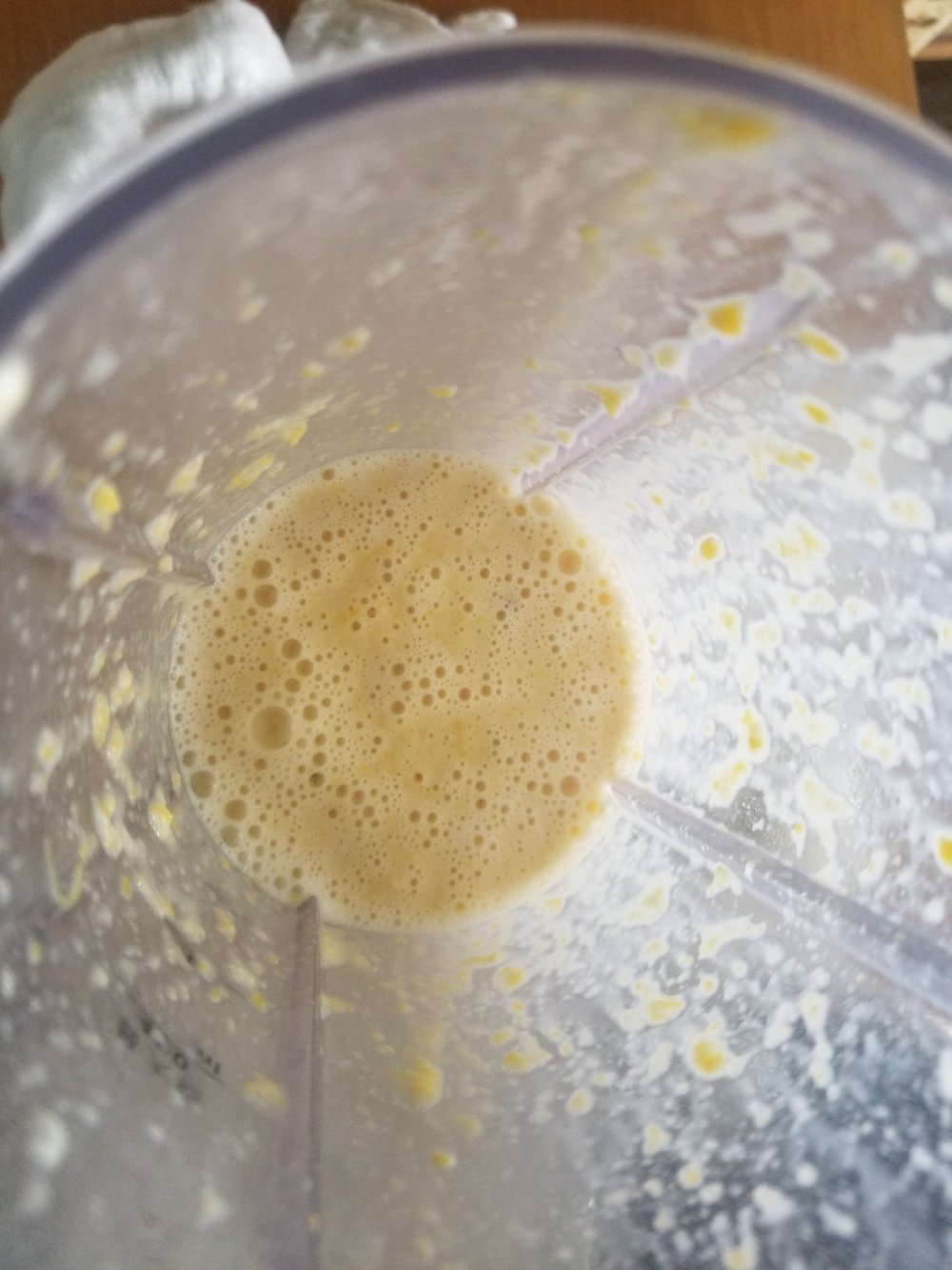 煮たら芯はとりだして、実を豆乳とともにミキサーへ。