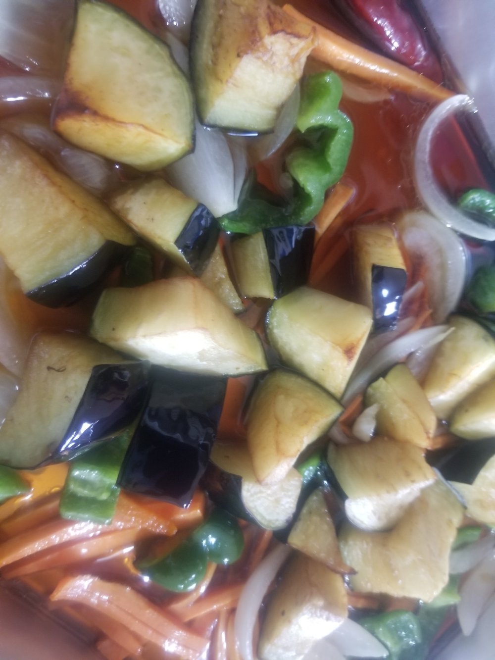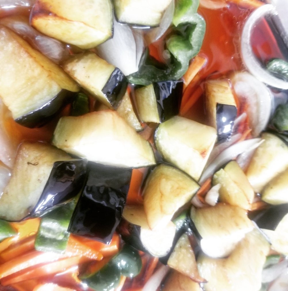 揚がった野菜をつけダレにつけて味をなじませたら、出来上がり。