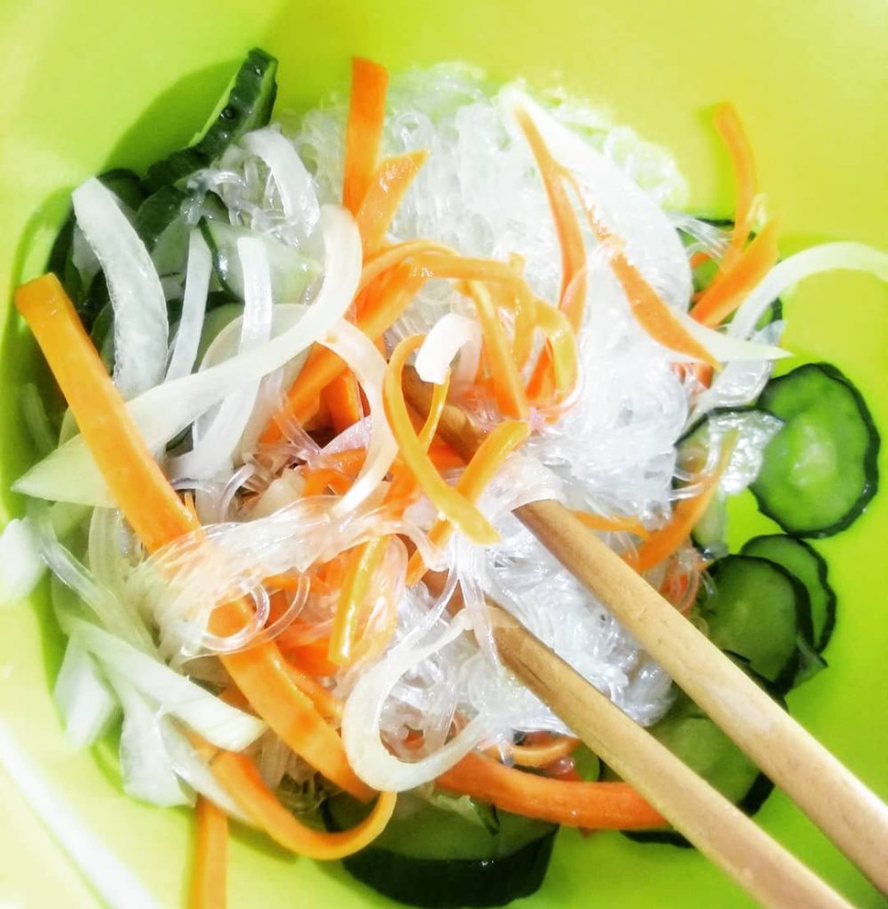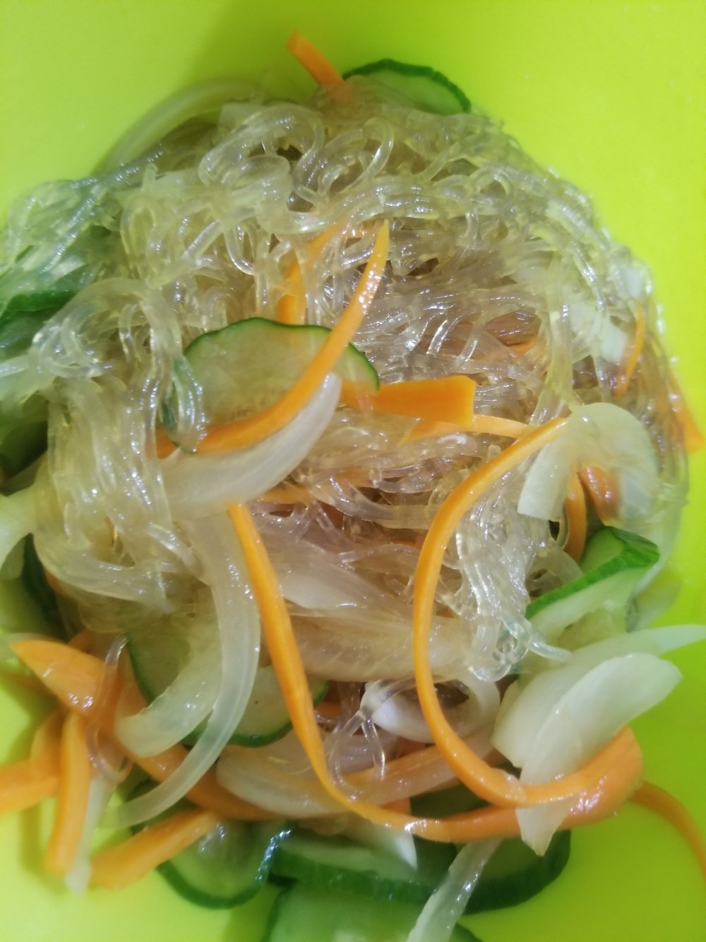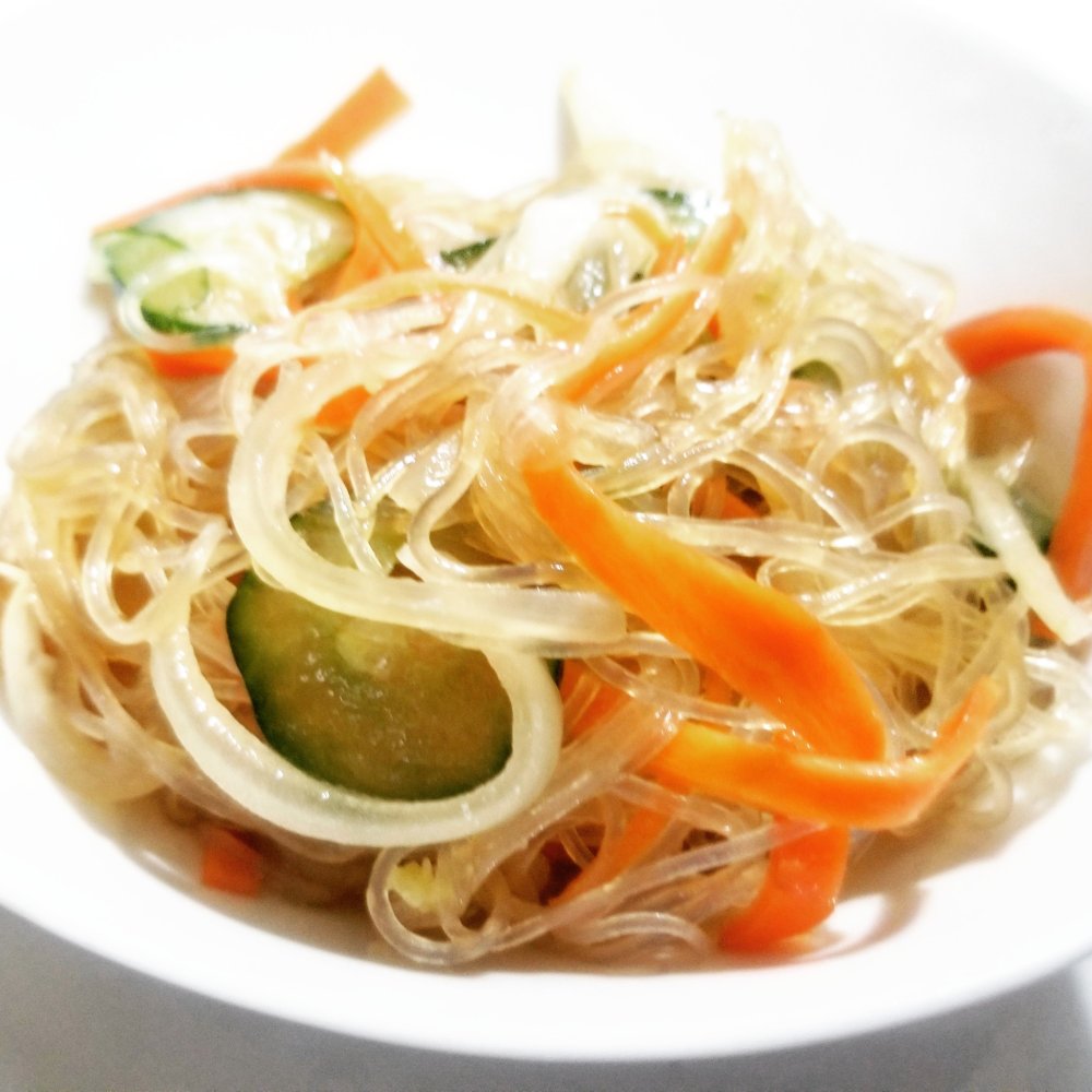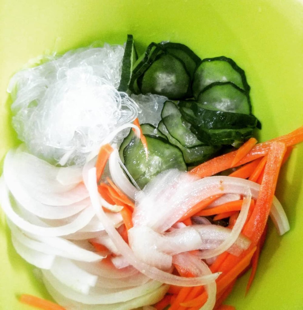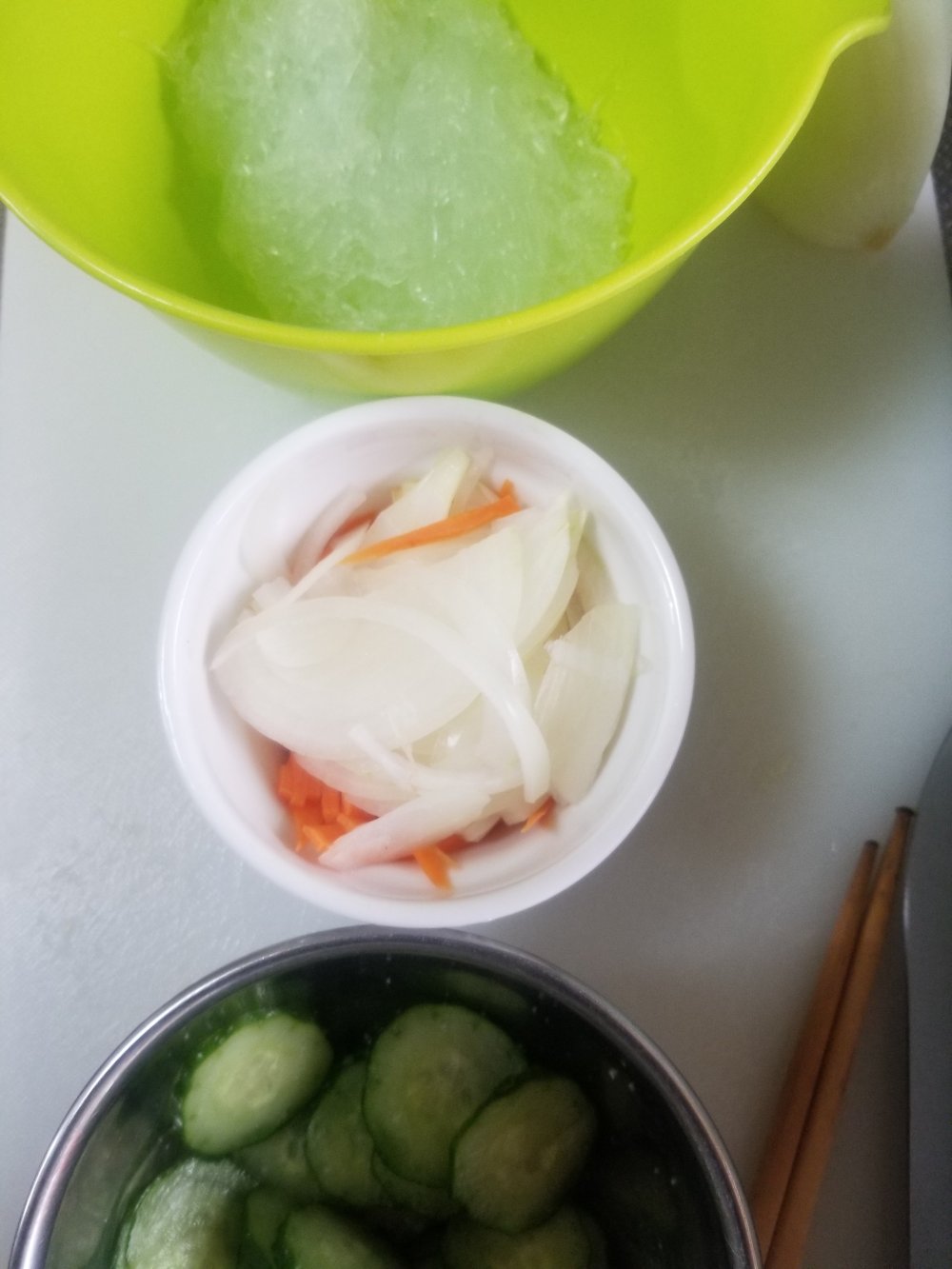 きゅうりはスライスして塩もみ、にんじんと玉ねぎは春雨と絡むようにカットして、電子レンジで加熱して冷まします。