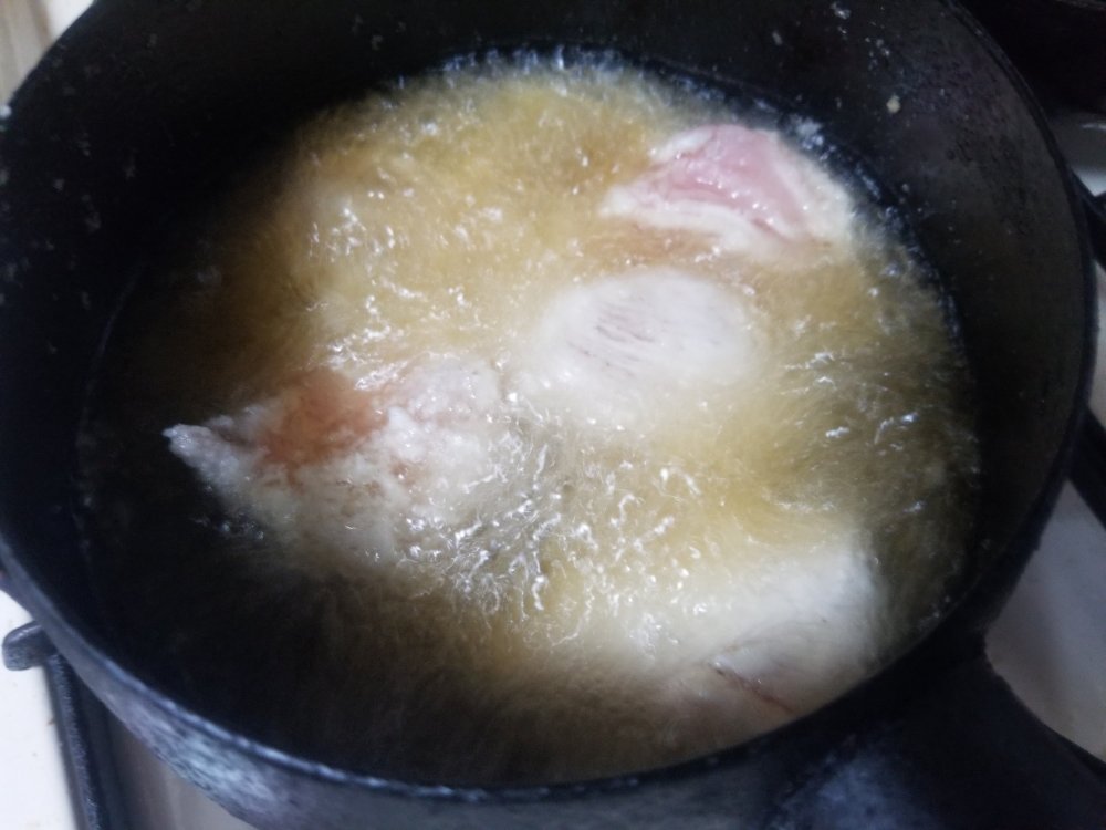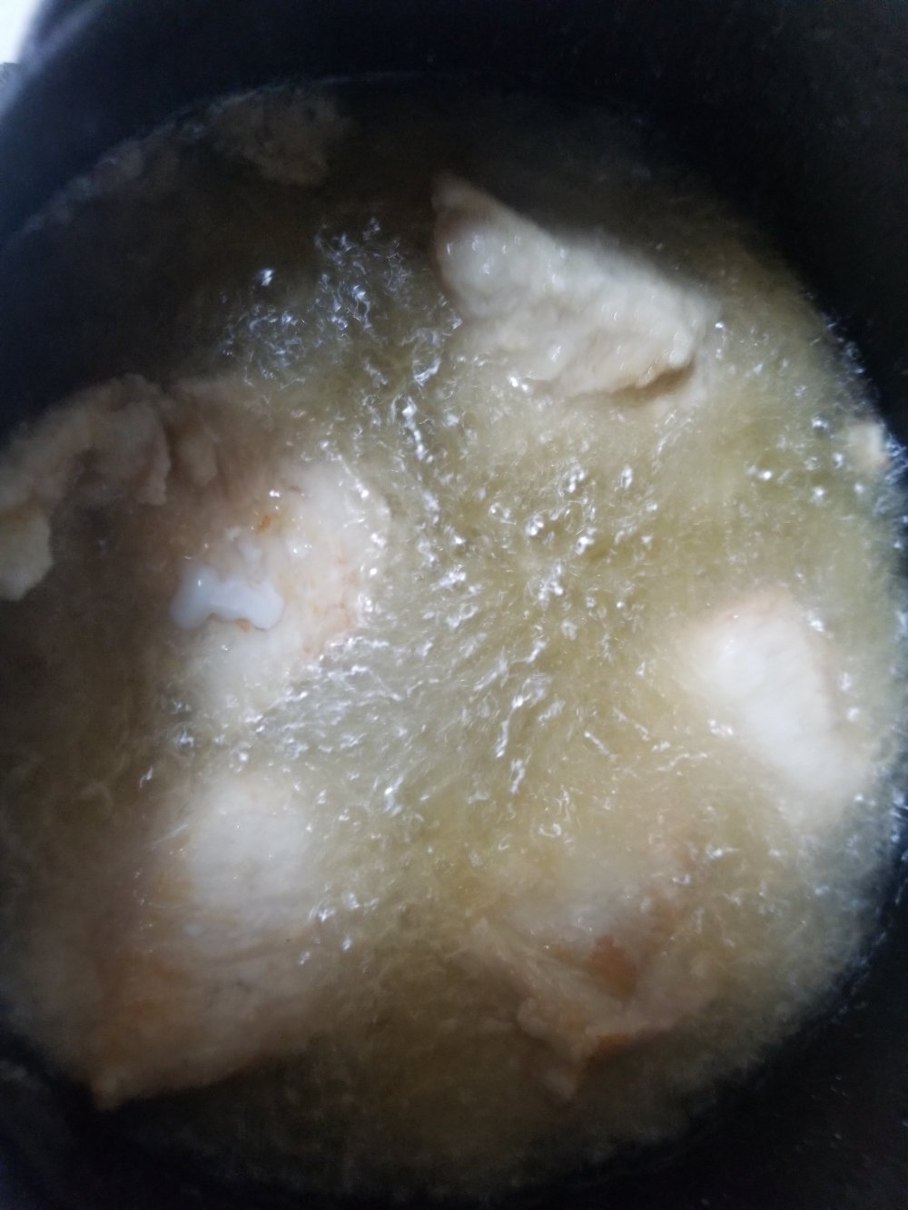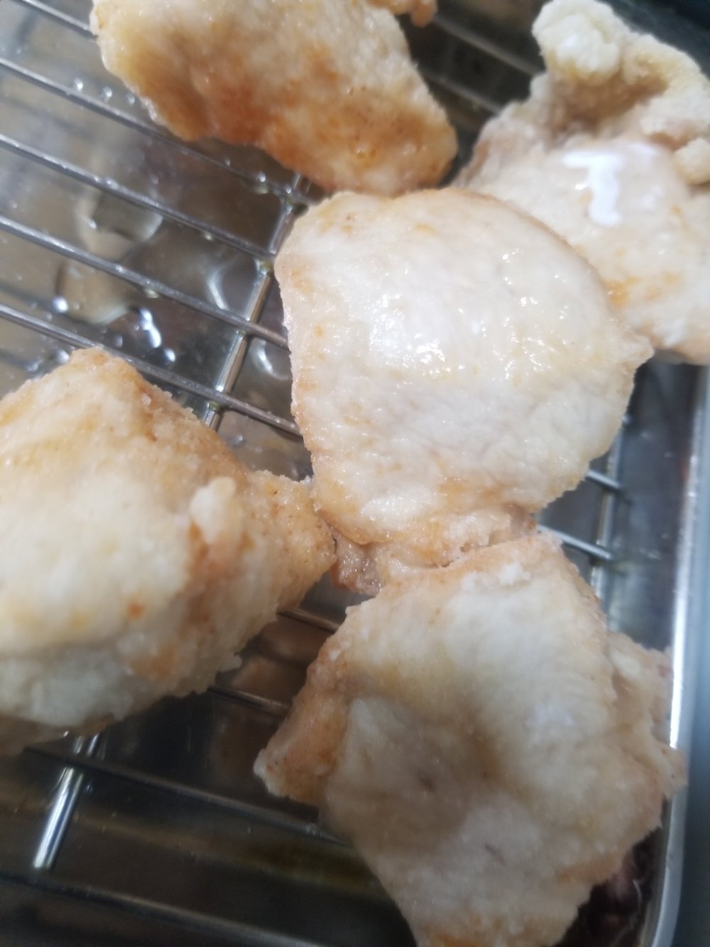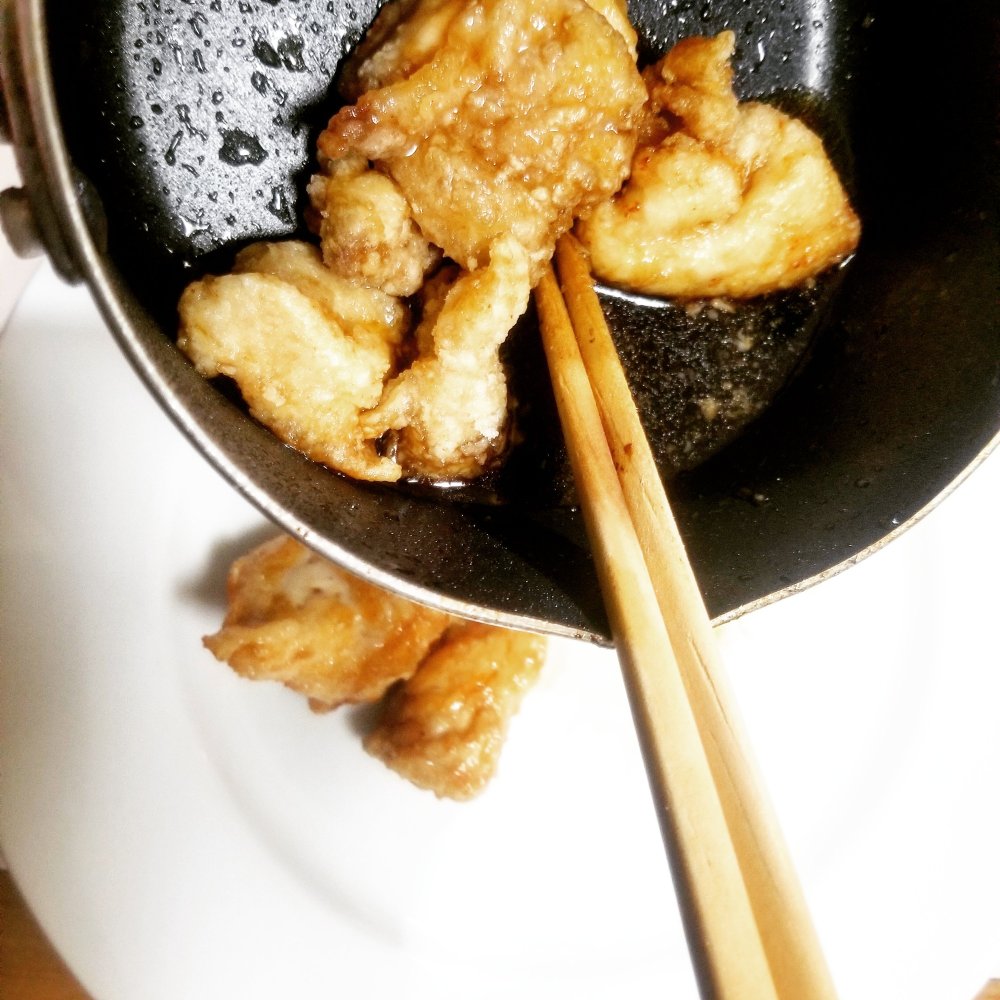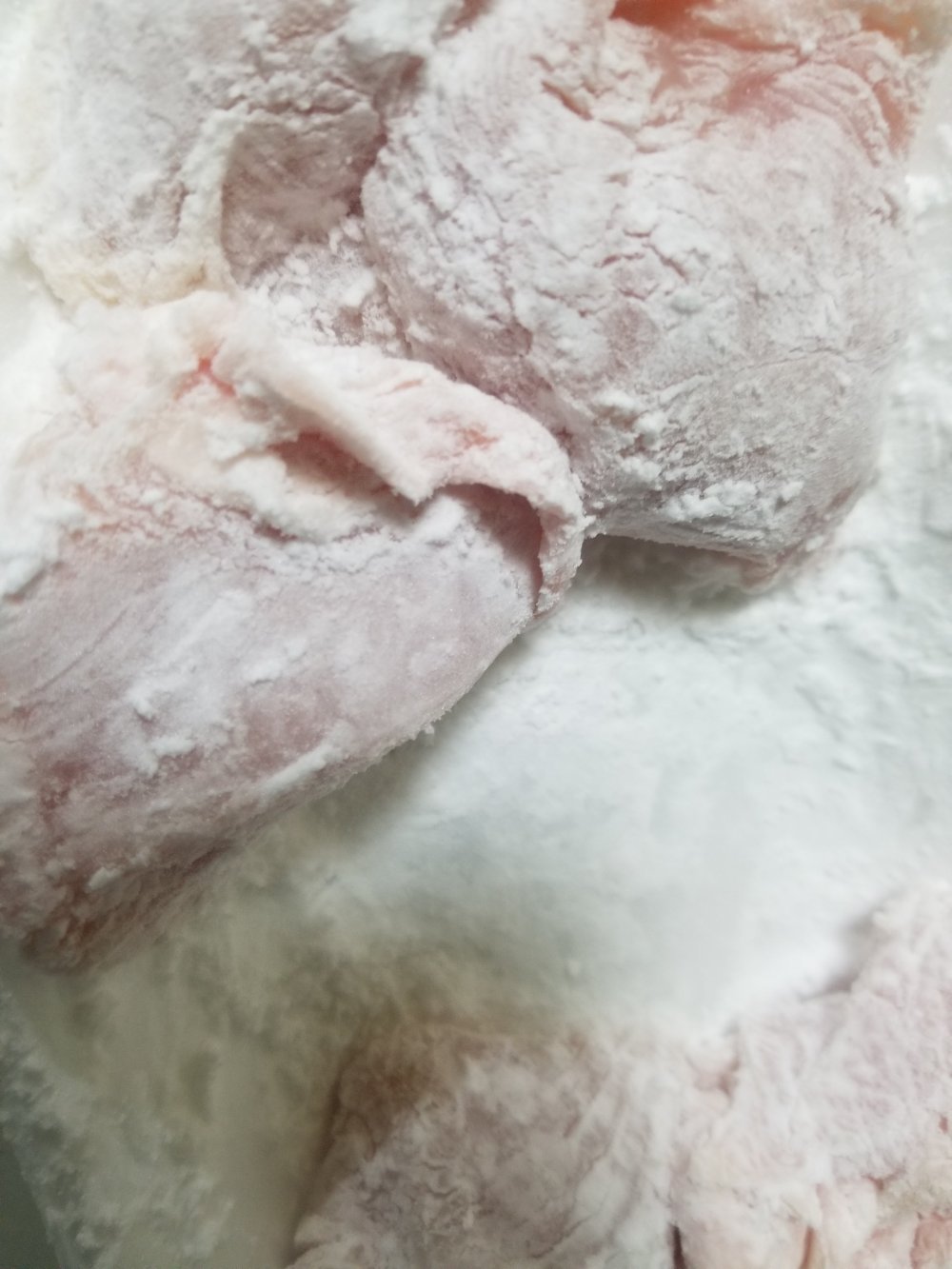 塩コショウした鶏肉の表面にしっかりと片栗粉をまぶします。