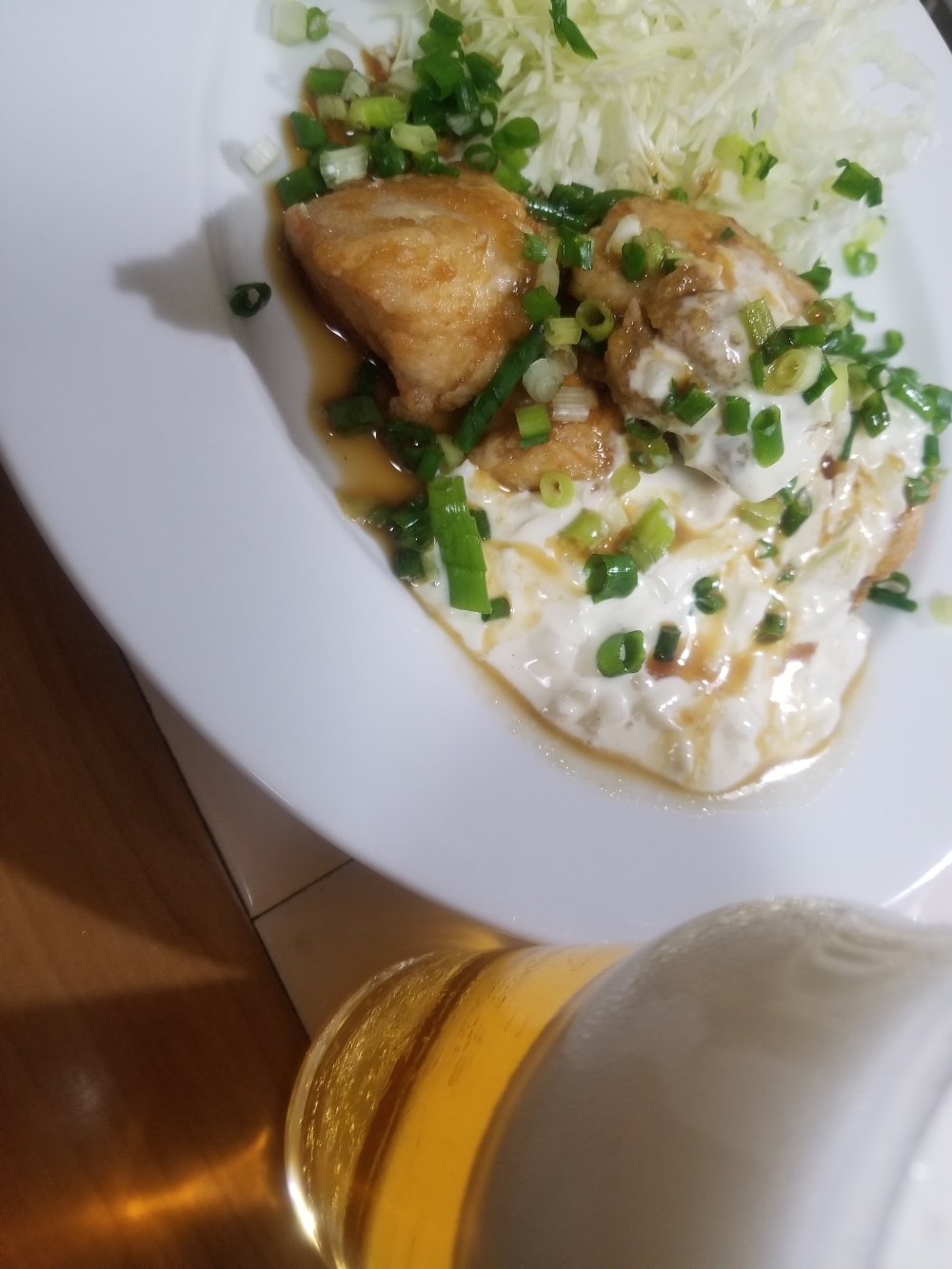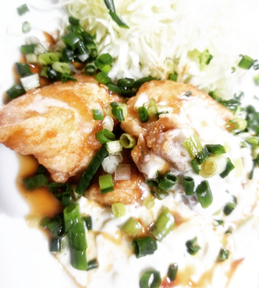 タルタルソースと彩りの万能ねぎをトッピングしたら、