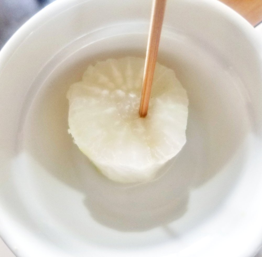 時短の秘訣は皮をむいて面取りした大根を、やわらかくなるまでレンジすること。
