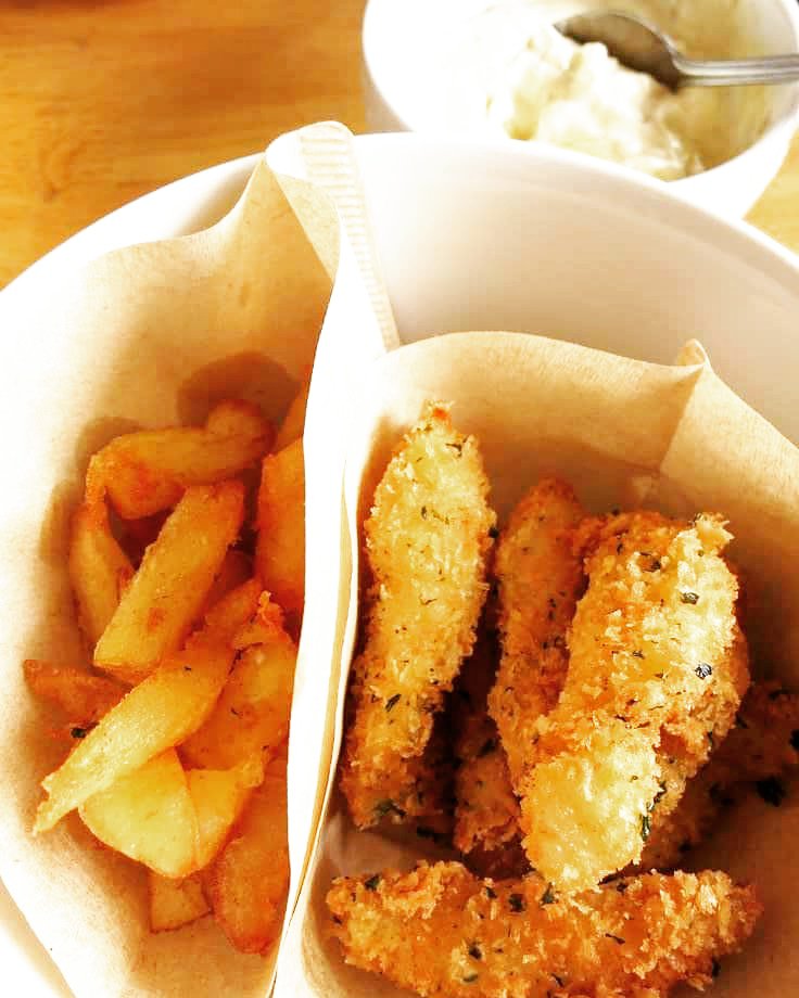 揚がったらさっと塩を振って、タルタルソースとともに盛り付ければ、フィッシュ・アンド・チップスのちょっとおしゃれなおつまみスタイルです。