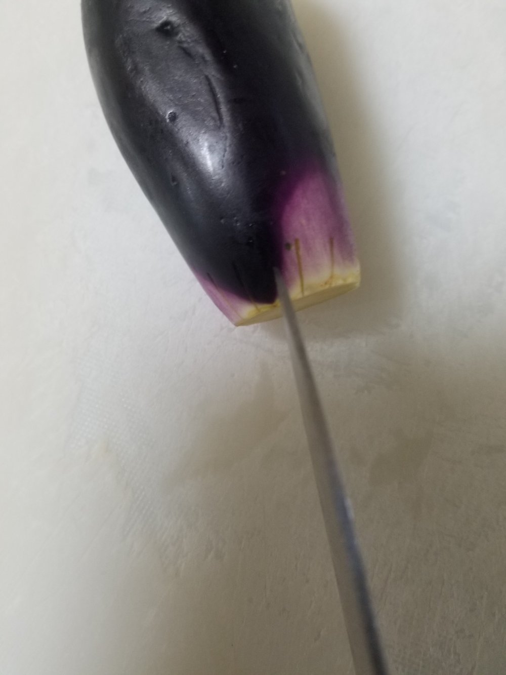 茄子のヘタを落とし、切り込みを入れます。