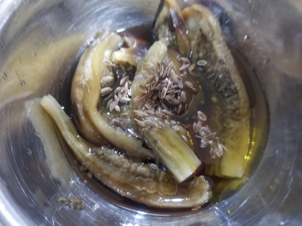茄子を手で縦に裂いてボウルに入れ、麺つゆ、オリーブオイルをからめ、