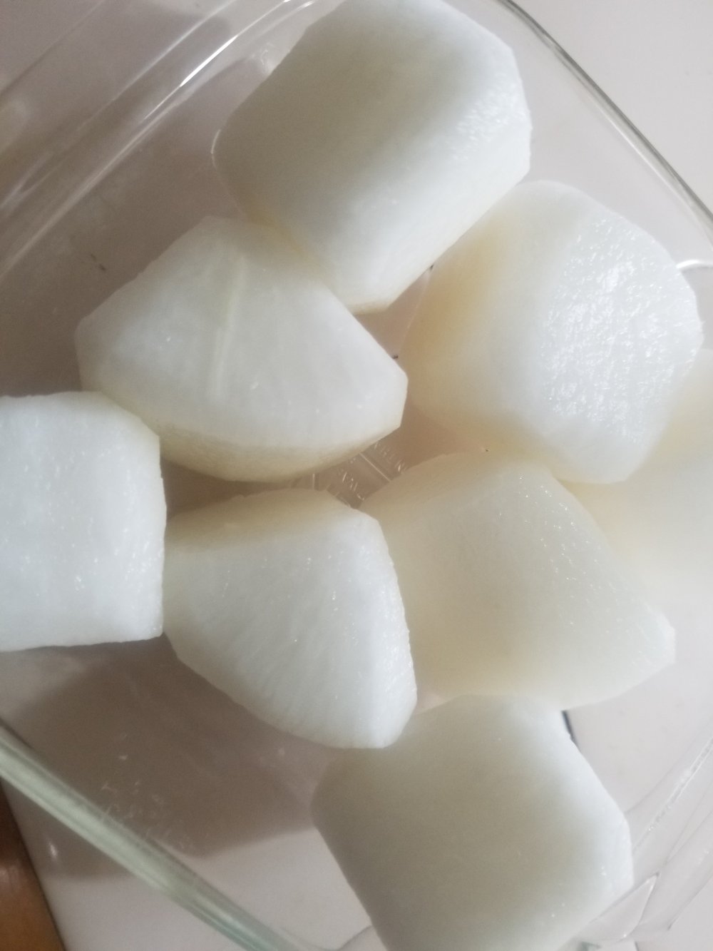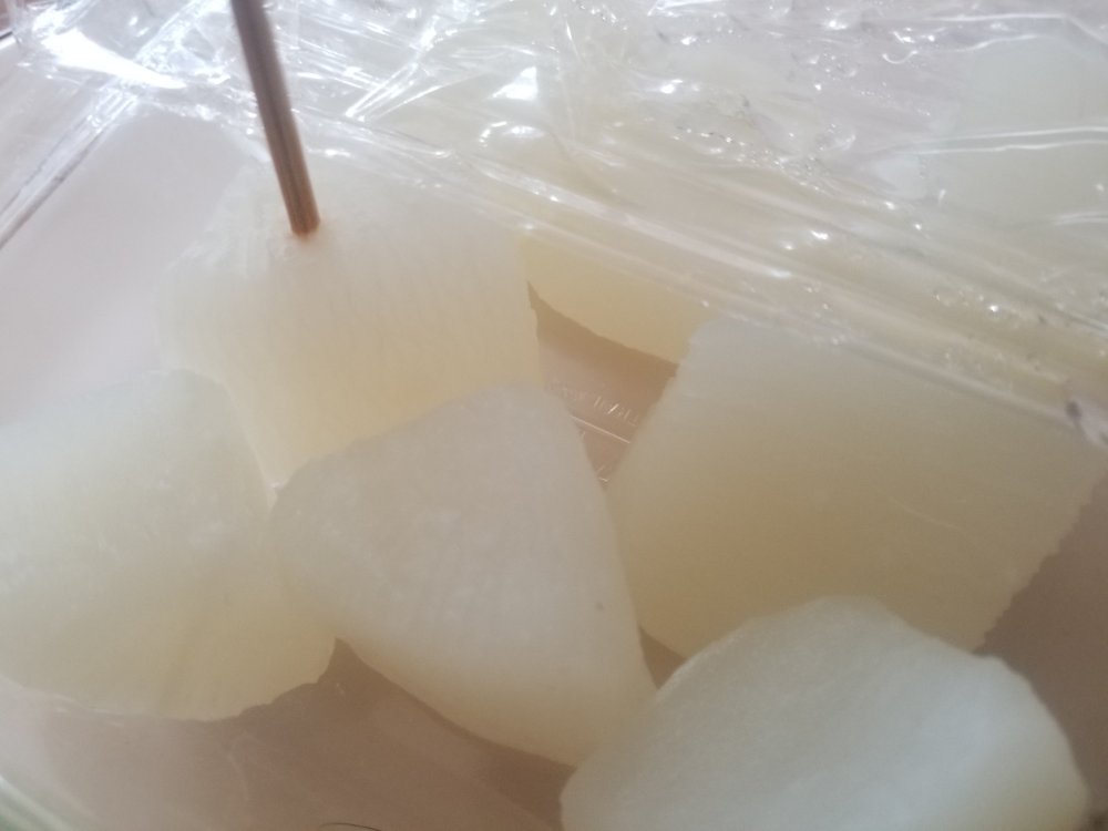 大根は一口大に切って面取りをして耐熱容器に入れてラップをかけ、電子レンジに7~8分かける。