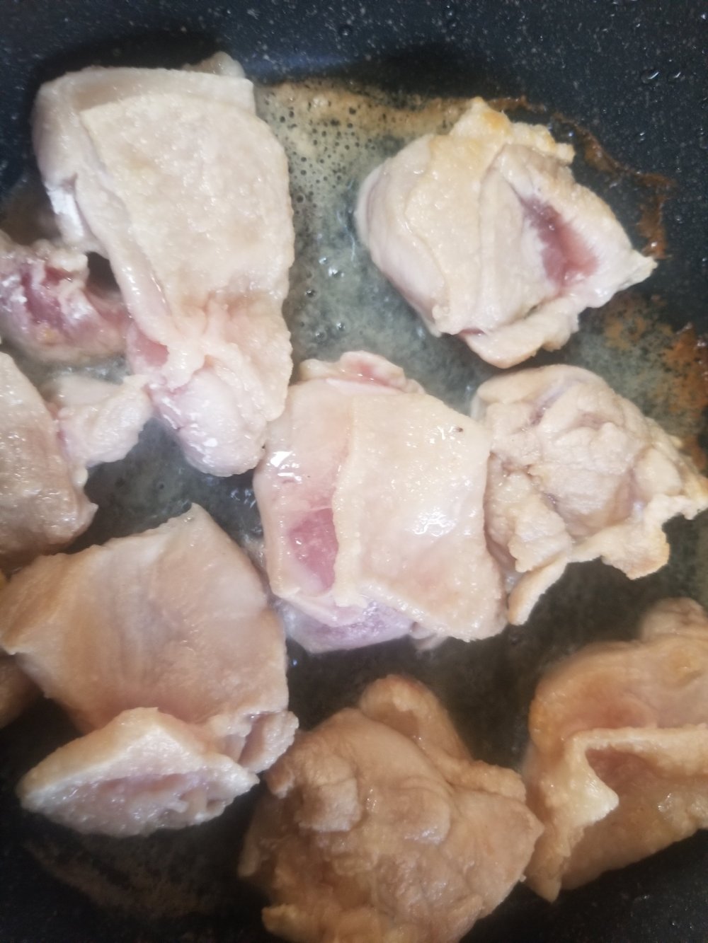 鶏肉は一口大に切り小麦粉をまぶして、焼き色を付ける。