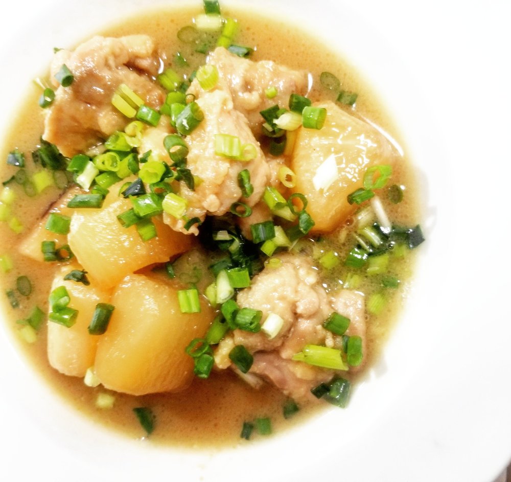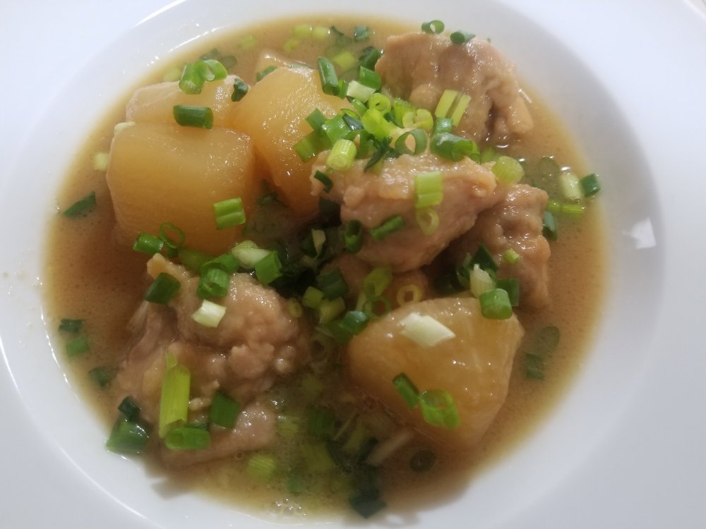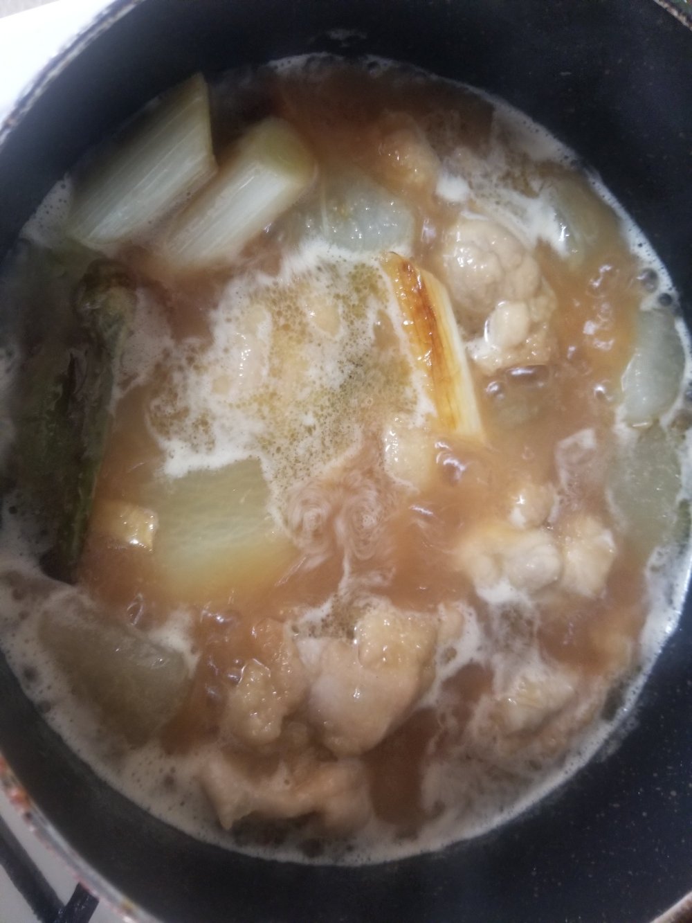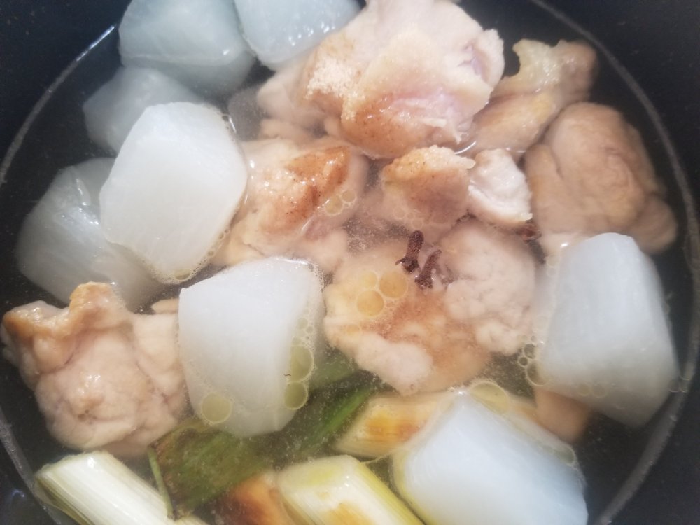 鍋に鶏肉、大根、ねぎを入れ、コンソメスープ、みりん、醤油、砂糖を入れ、