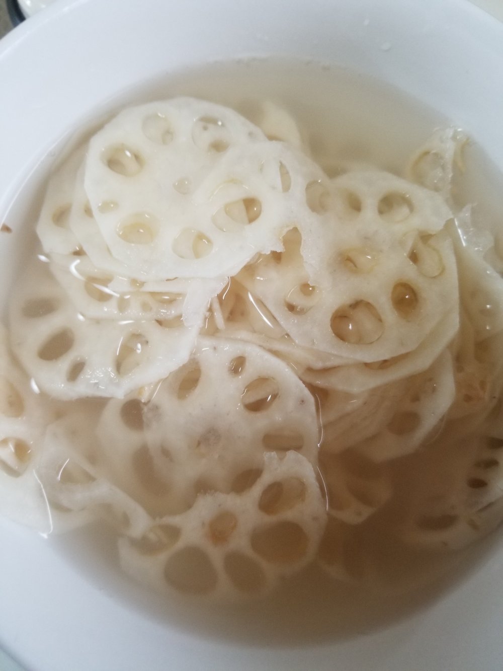 まずスライスしたレンコンを酢水にさらし、あくを抜きます。