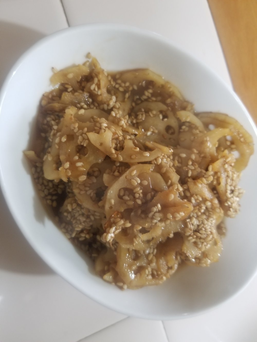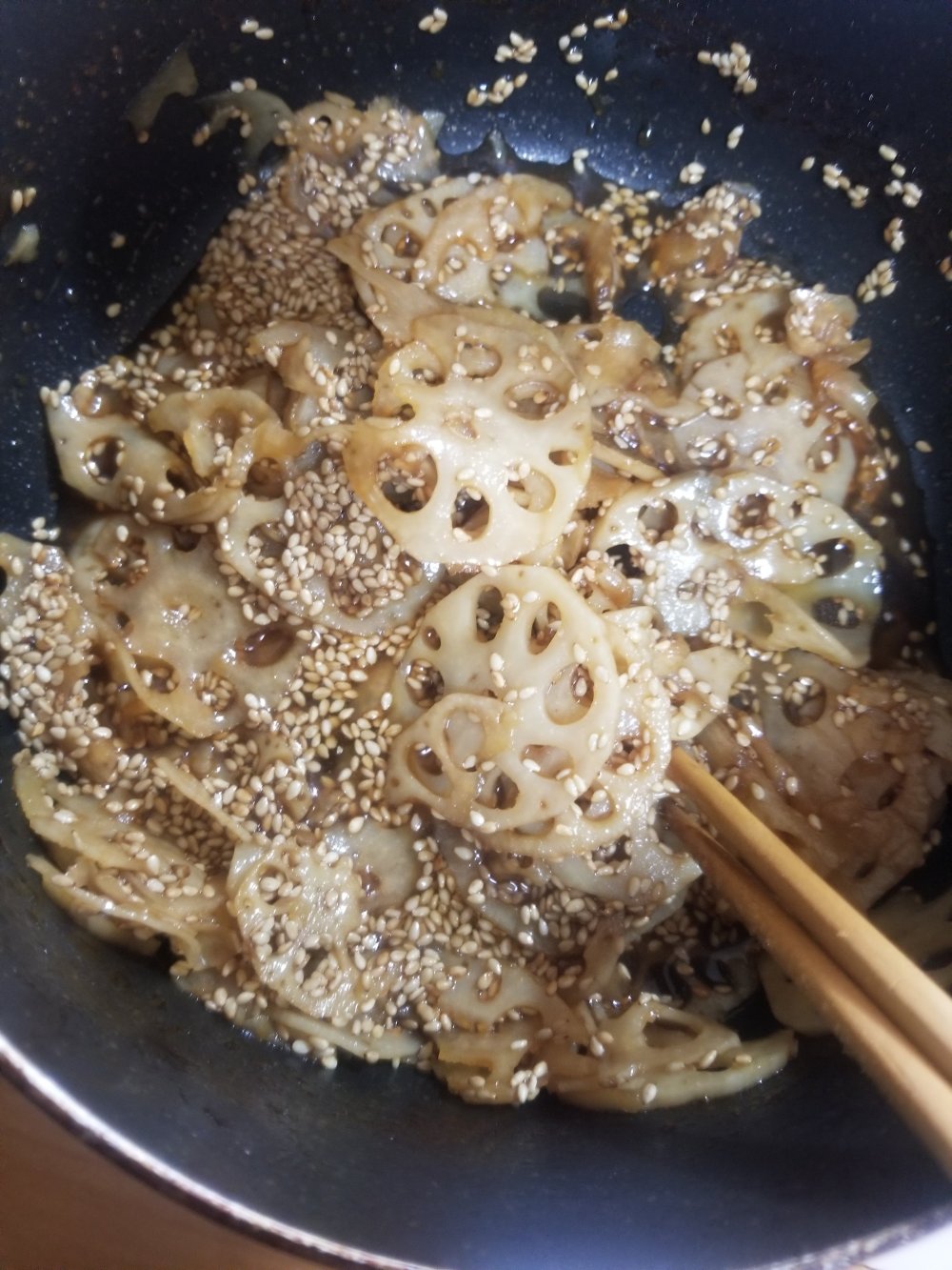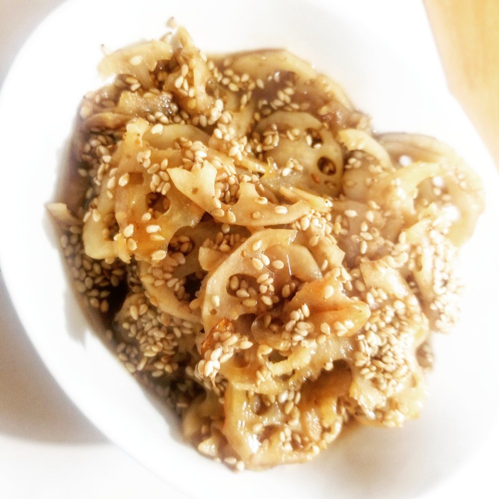 ごま油を敷いたフライパンでレンコンが半透明になる感じに炒めます。