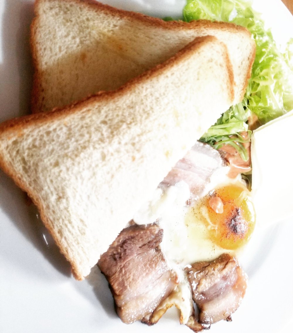 目玉焼きにはベーコン……といいたいところですが、冷蔵庫になかったので、冷凍保存してあった自家製チャーシューで。