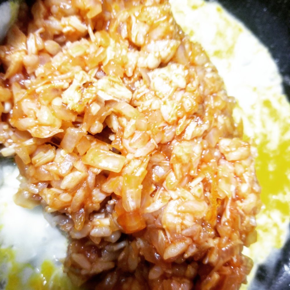 たっぷりの玉ねぎとえのきを混ぜ込んで、ご飯の量を控えます。