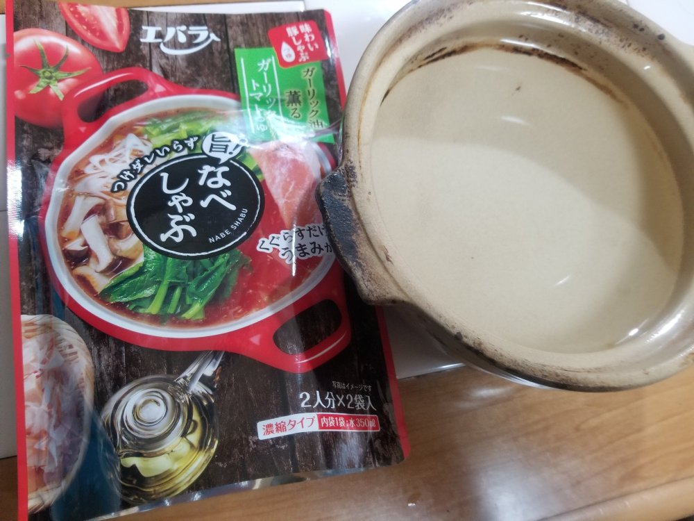 土鍋に水をはり、なべしゃぶ「ガーリックトマトつゆ」を入れます。