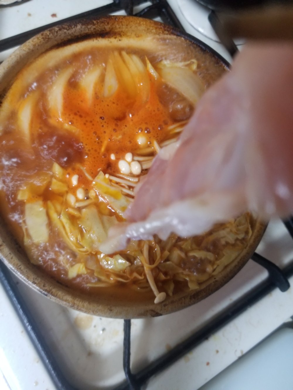 土鍋に玉ねぎ、セロリ、えのき、キャベツを入れて煮込みます。