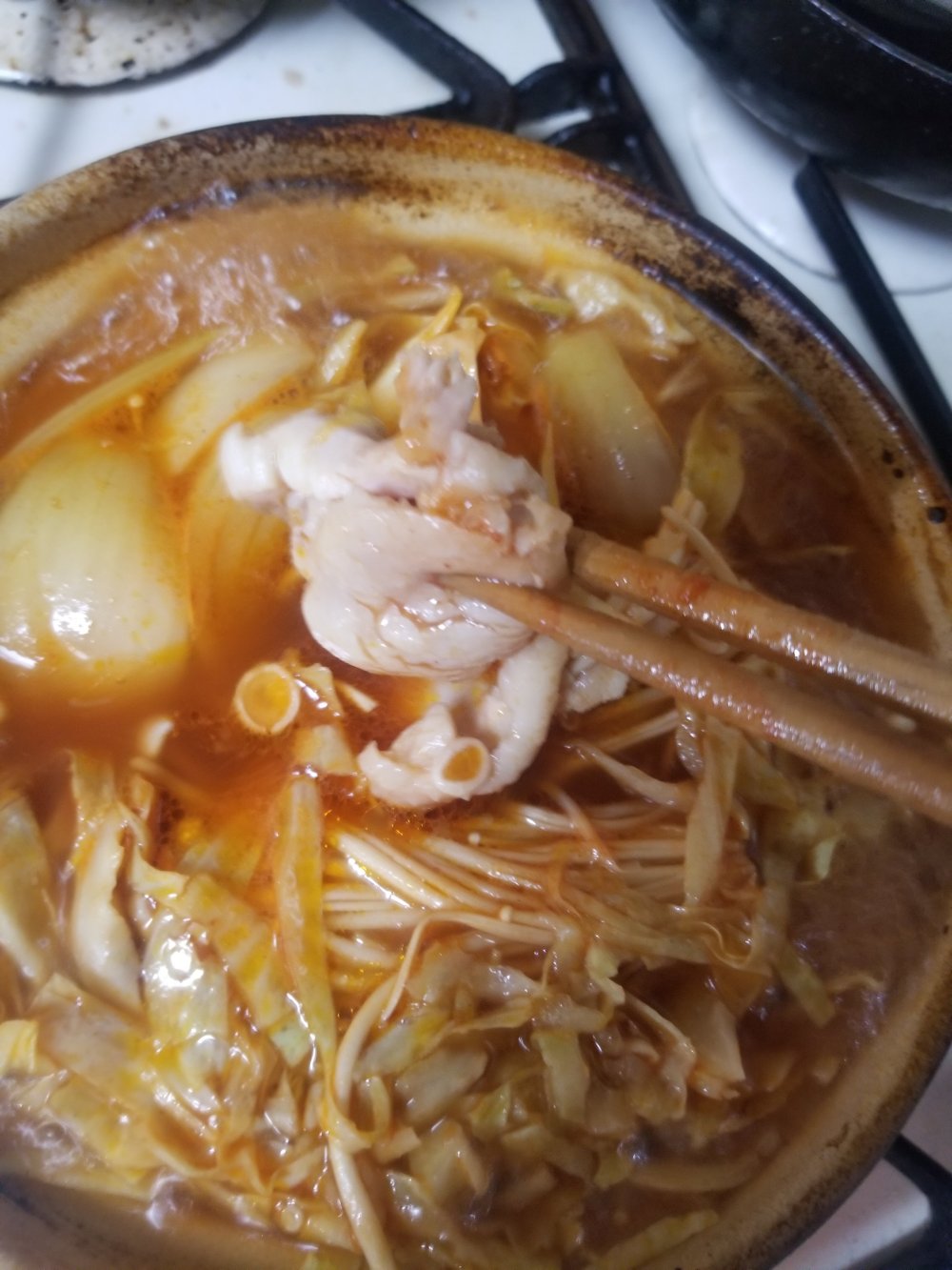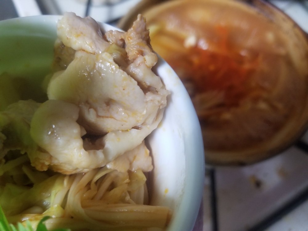 ほどよく煮えたら鶏肉をしゃぶしゃぶとしながら完全に火を通します。