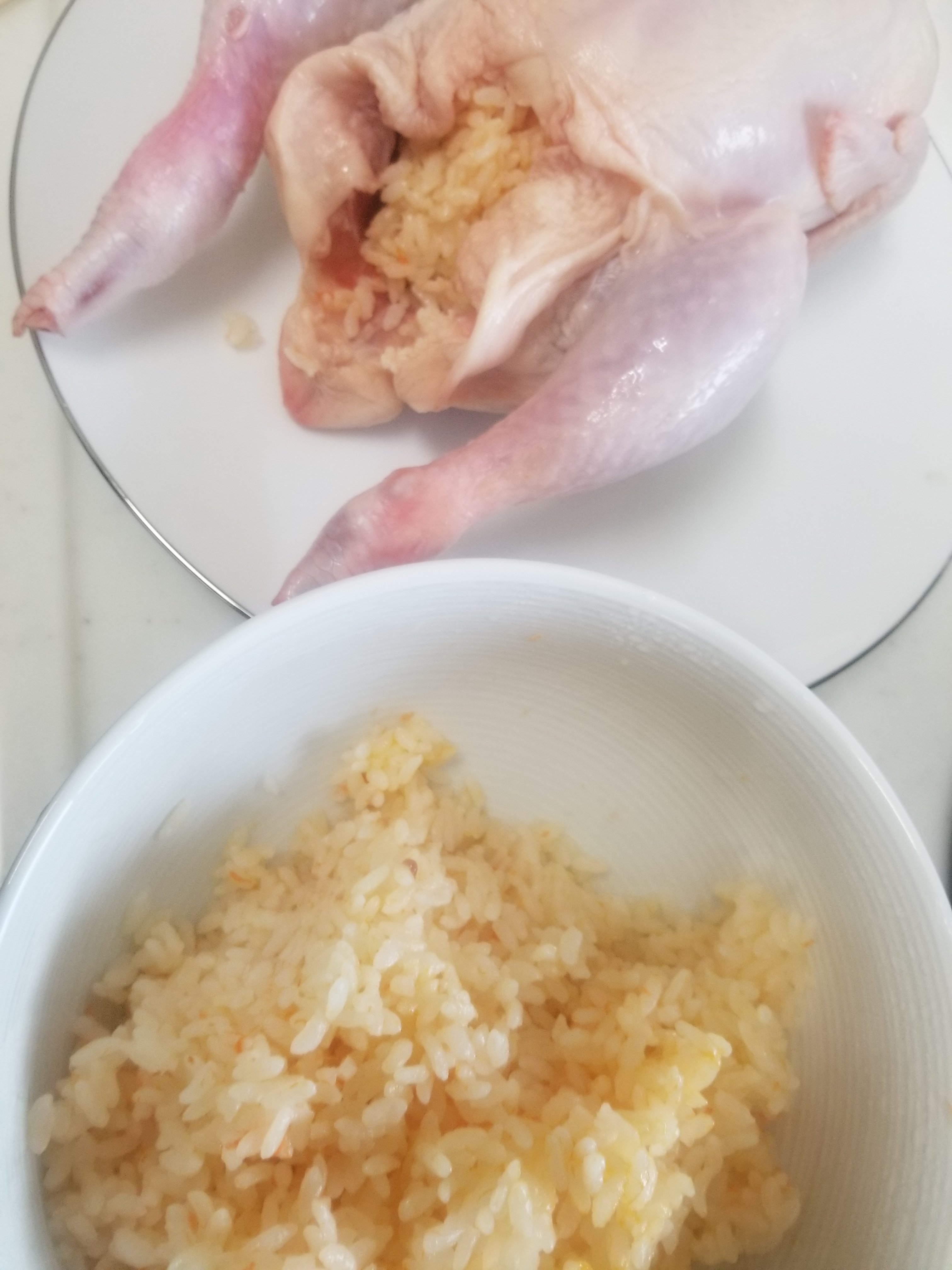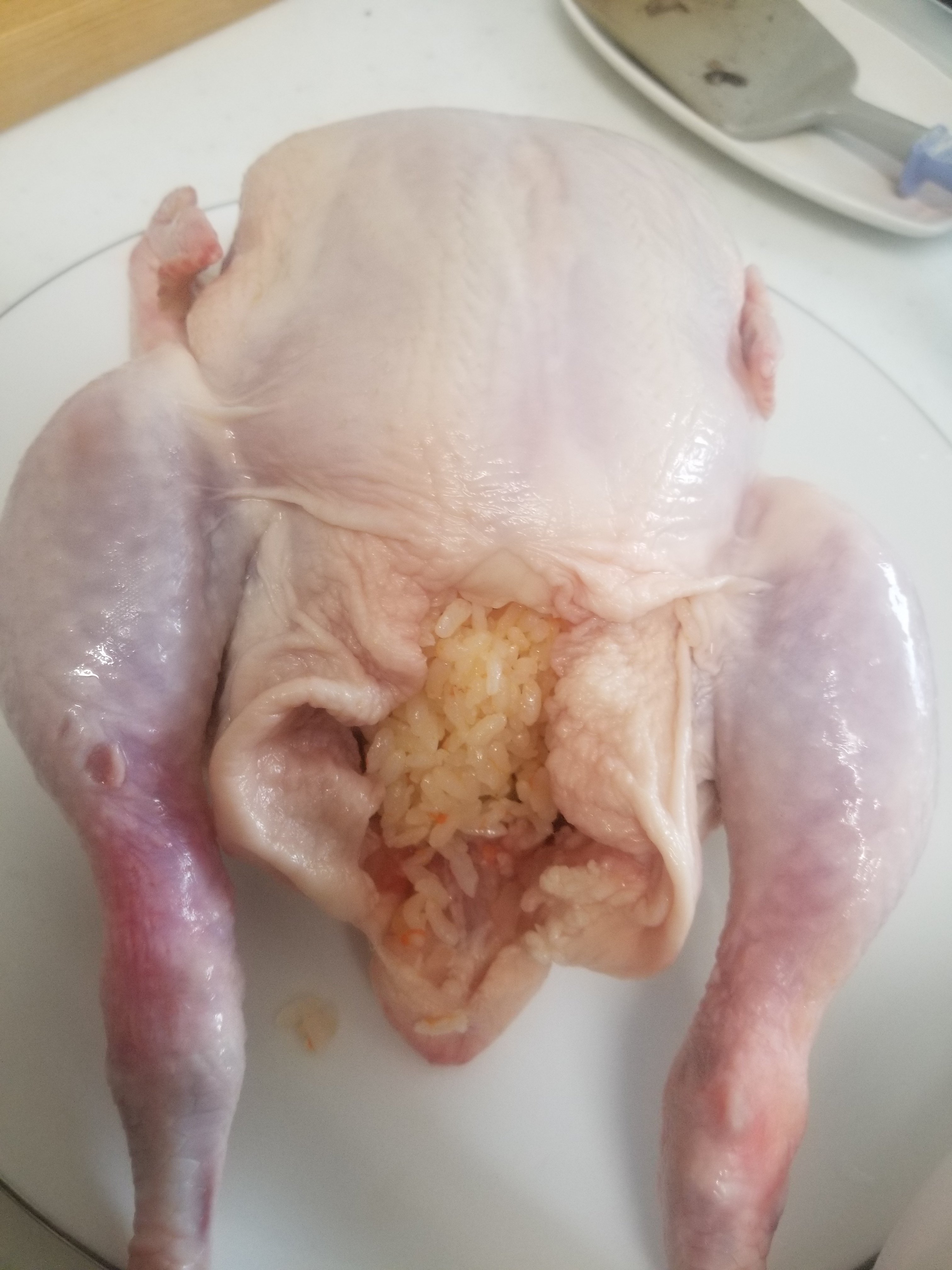 空洞になった鶏のおなかには詰め物をします。