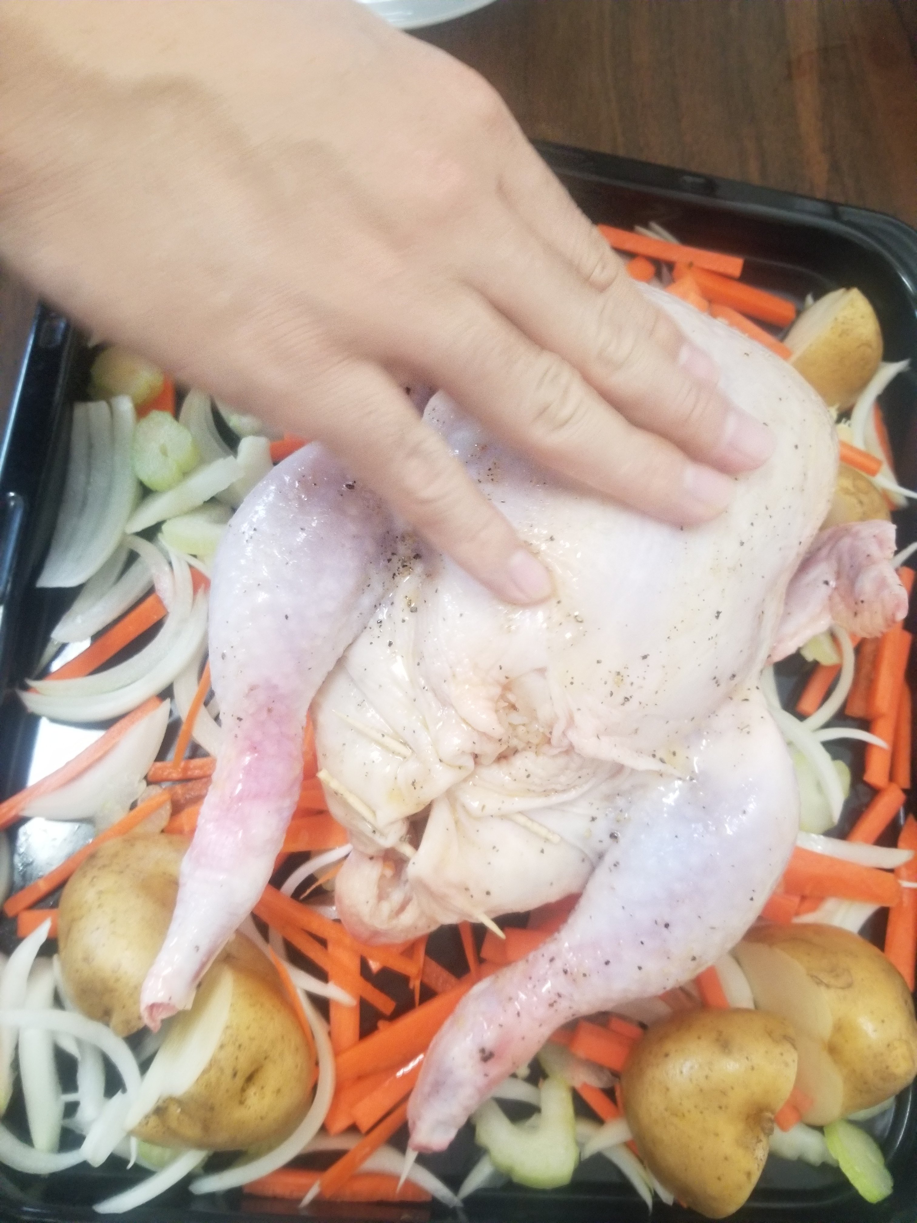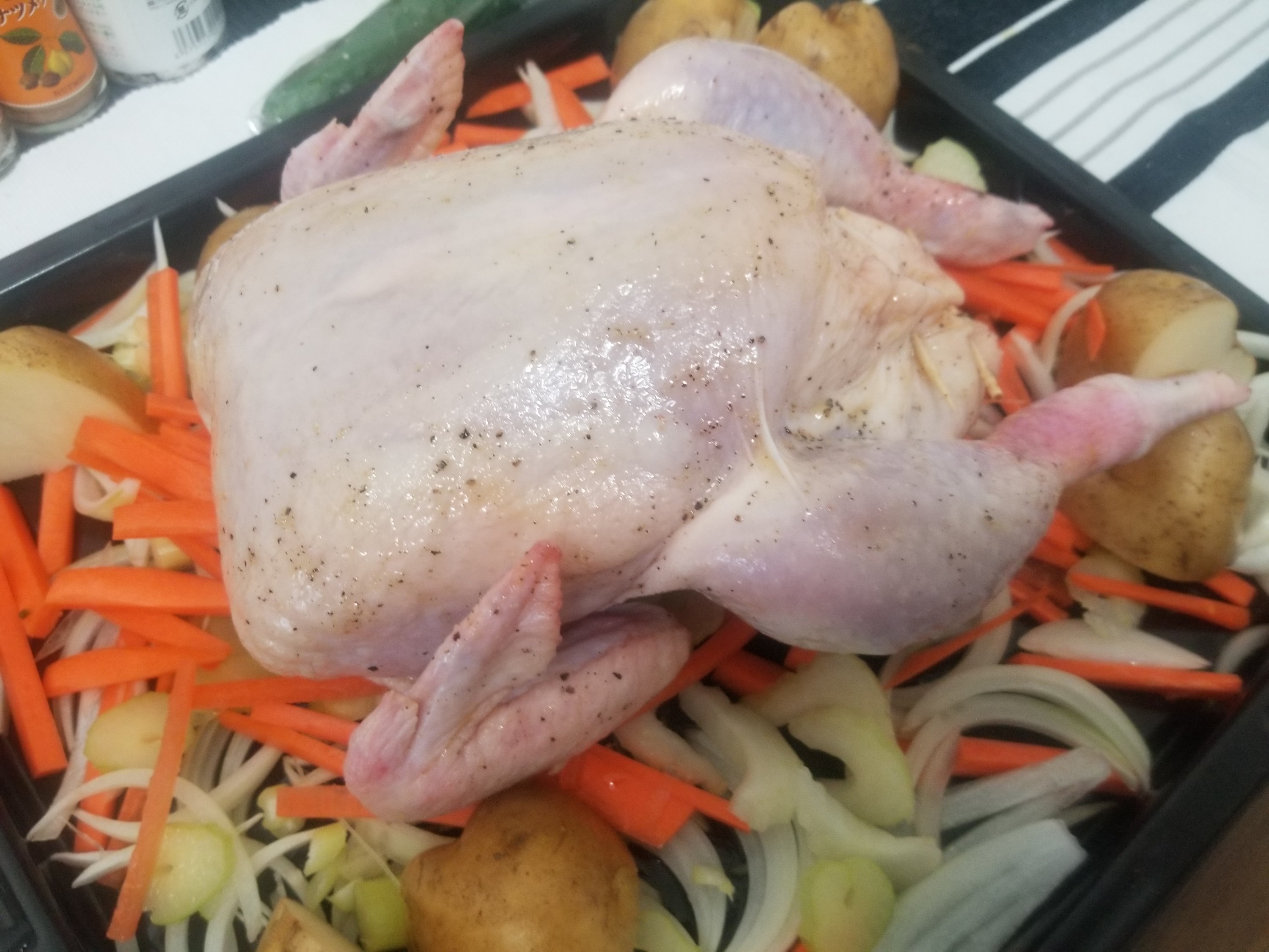 オーブントレイに玉ねぎ、セロリ、にんじんを敷き詰めて、その上に鶏肉を。