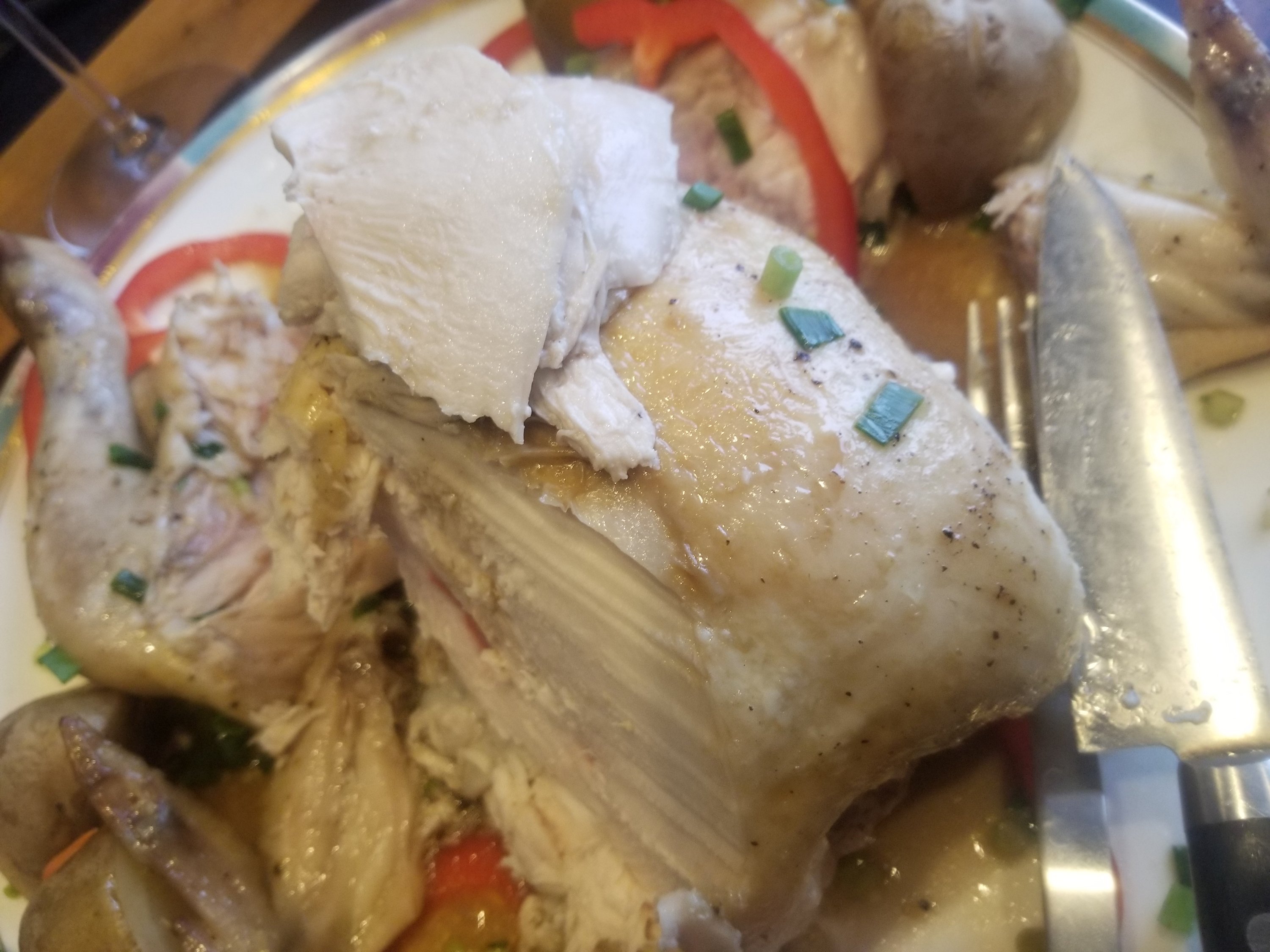 手羽とモモは関節にナイフを入れて切り分け、胸は薄くスライスしていきます。
