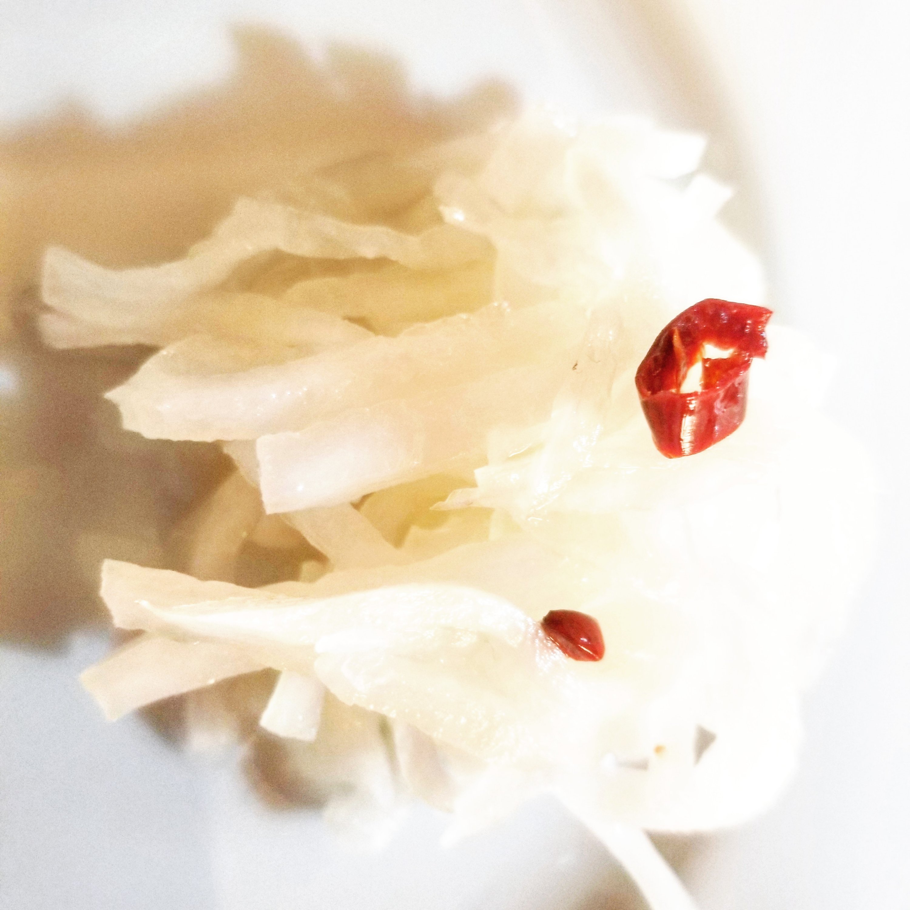 ボウルに酢、砂糖、大根と小口切りの鷹の爪、昆布を入れてよく和える。