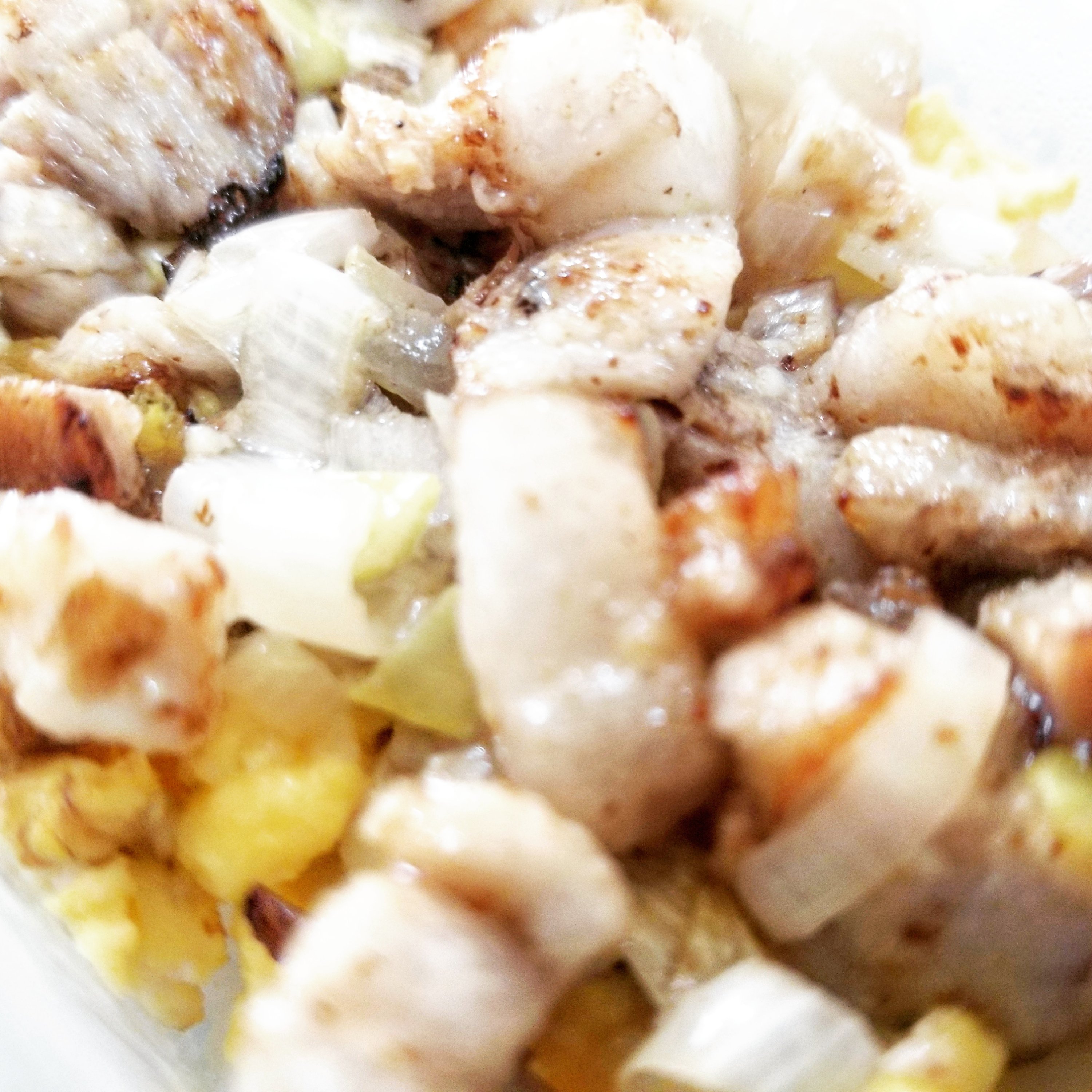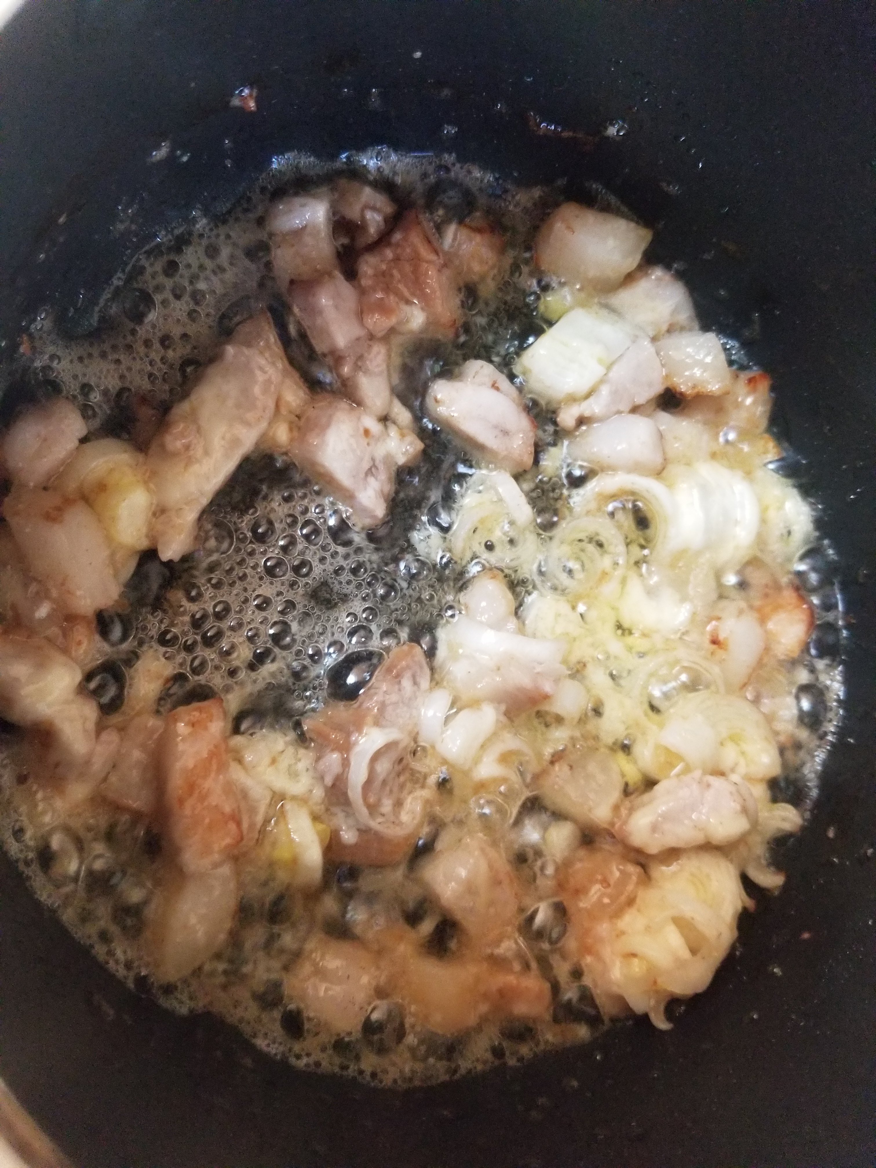 マヨネーズが溶けてきたら、細かく切ったネギとチャーシューを入れて炒めます。