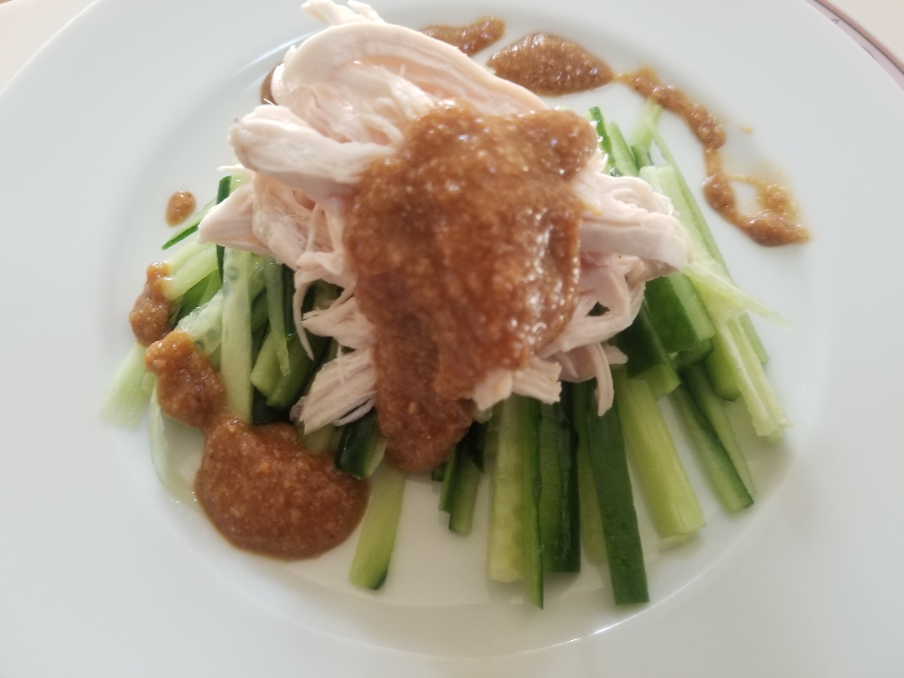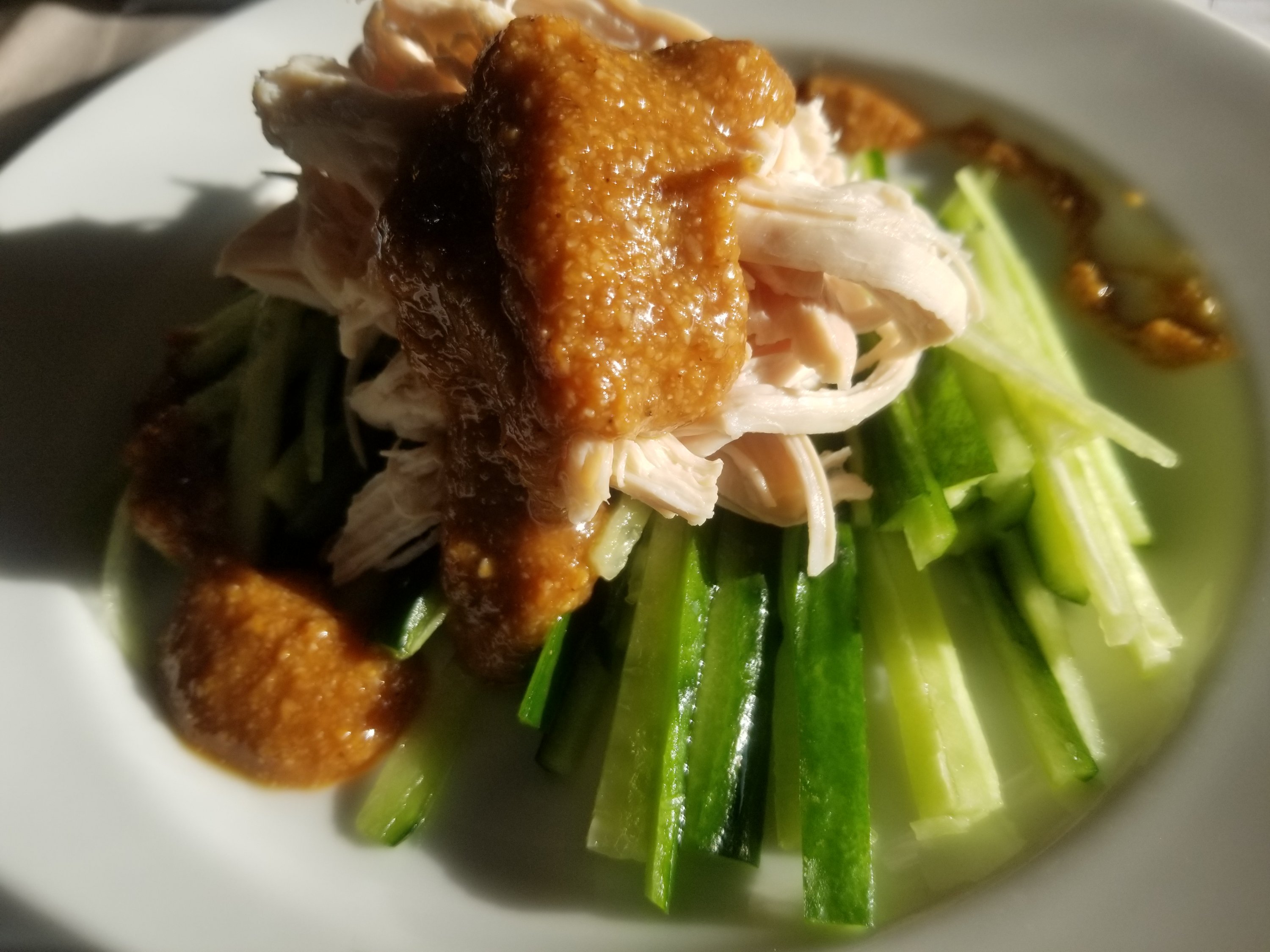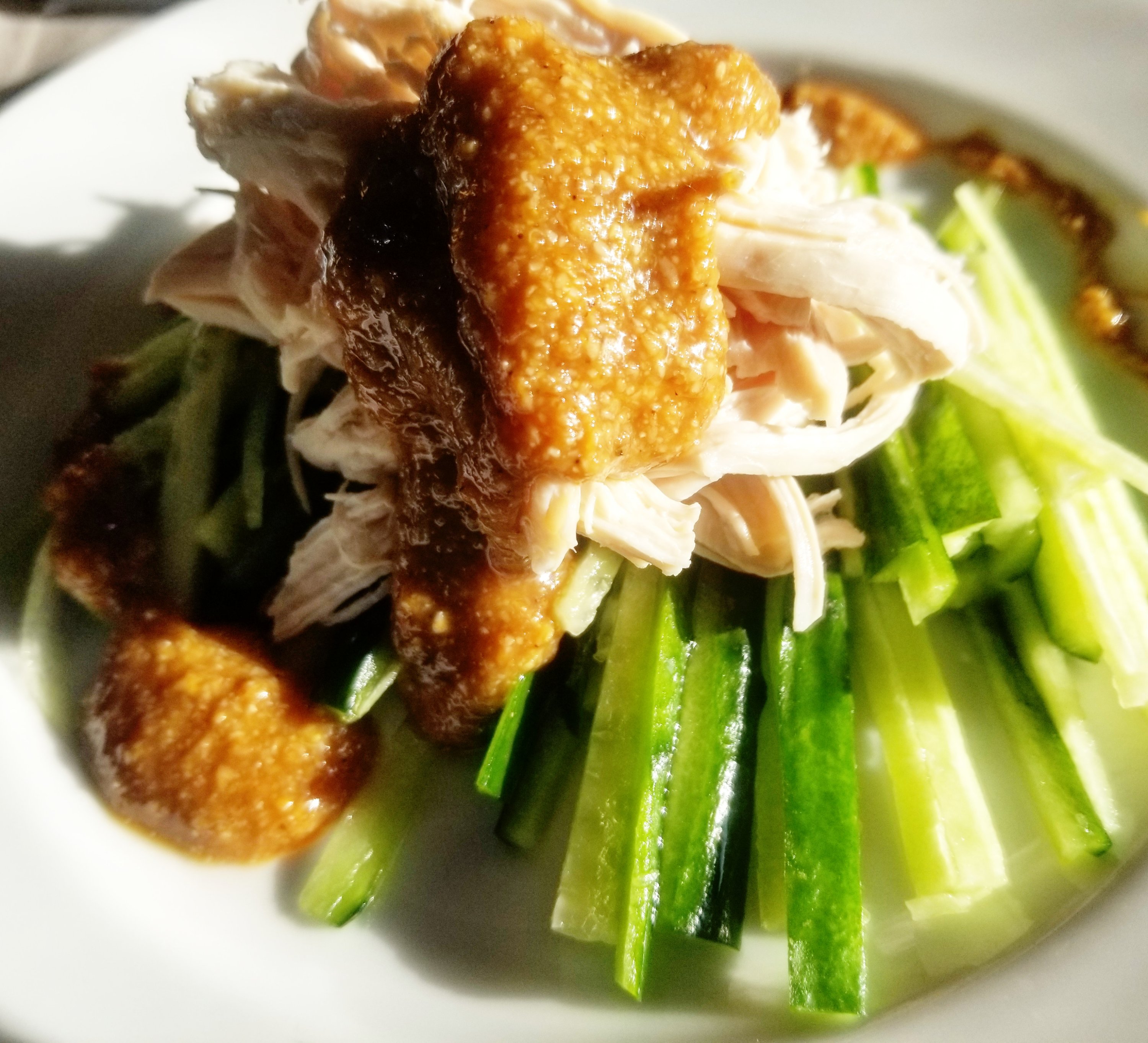 細く切りそろえたきゅうりの上に鶏肉を載せて、タレをかけたらできあがり。