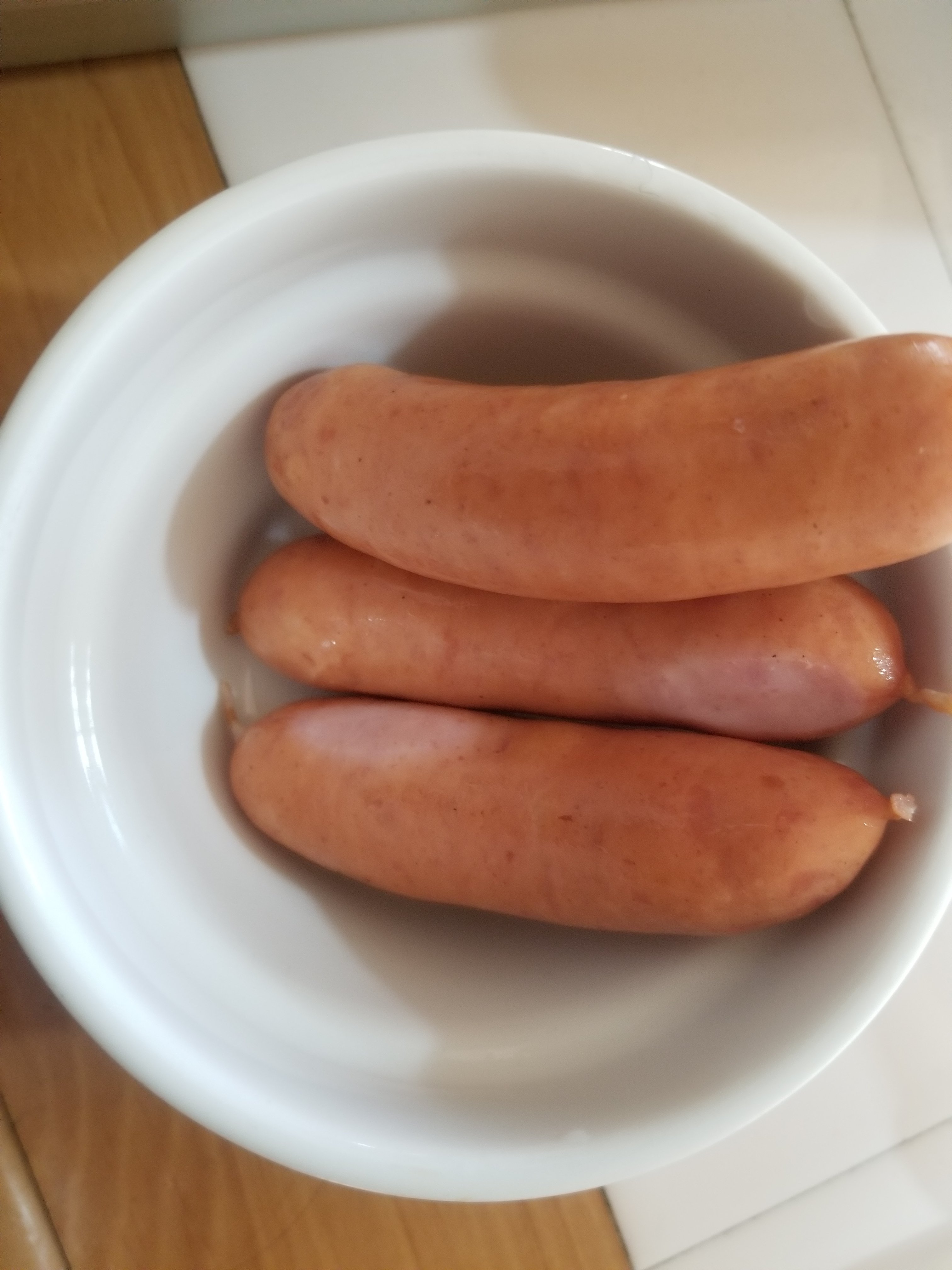 公式レシピの「3本:500W 約30秒」でシャウエッセンを電子レンジで加熱します。