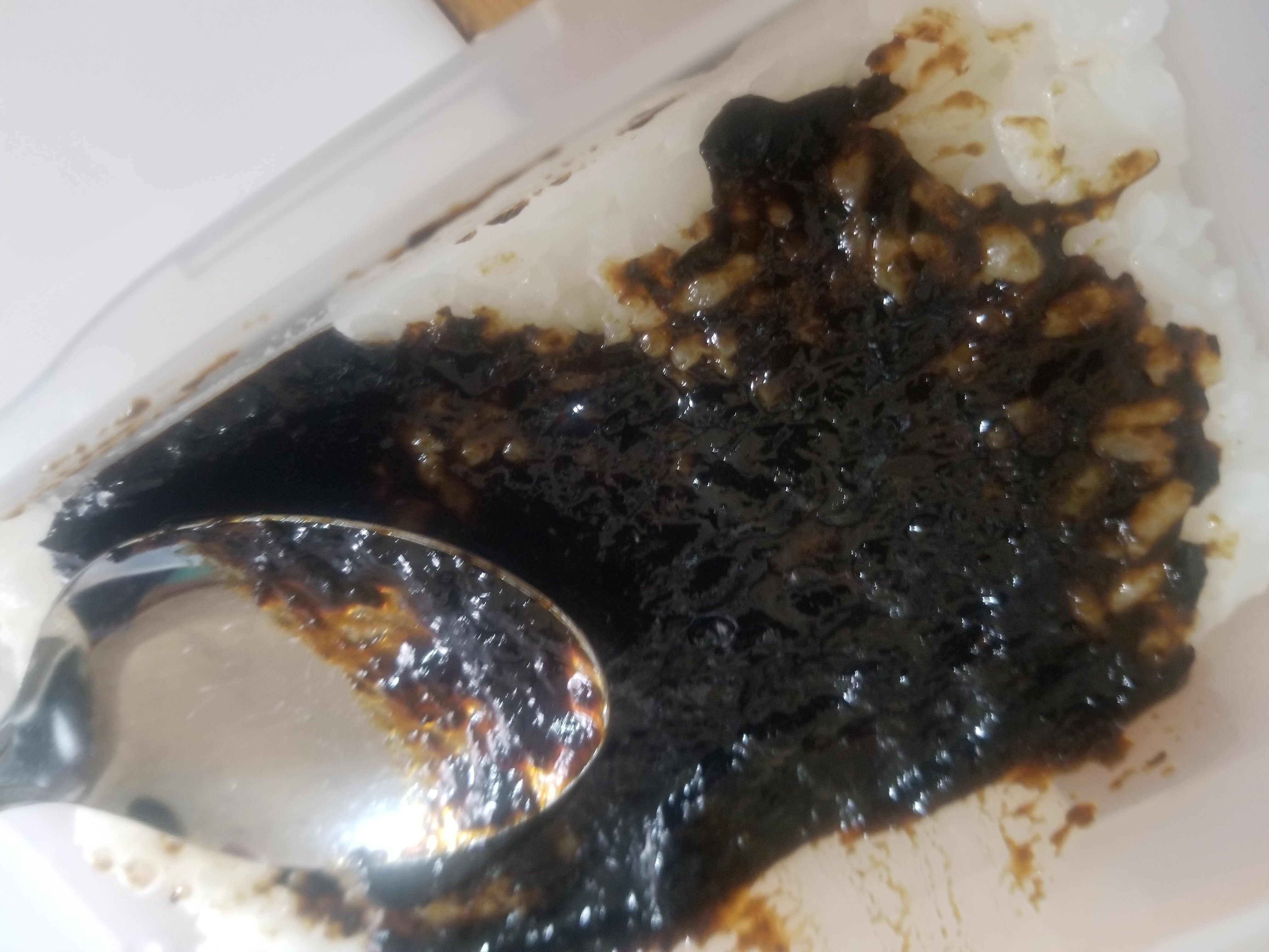 お弁当箱の深さ半分くらいに敷いたご飯の上に、のりの佃煮をスプーンの背で伸ばしながら塗ります。
