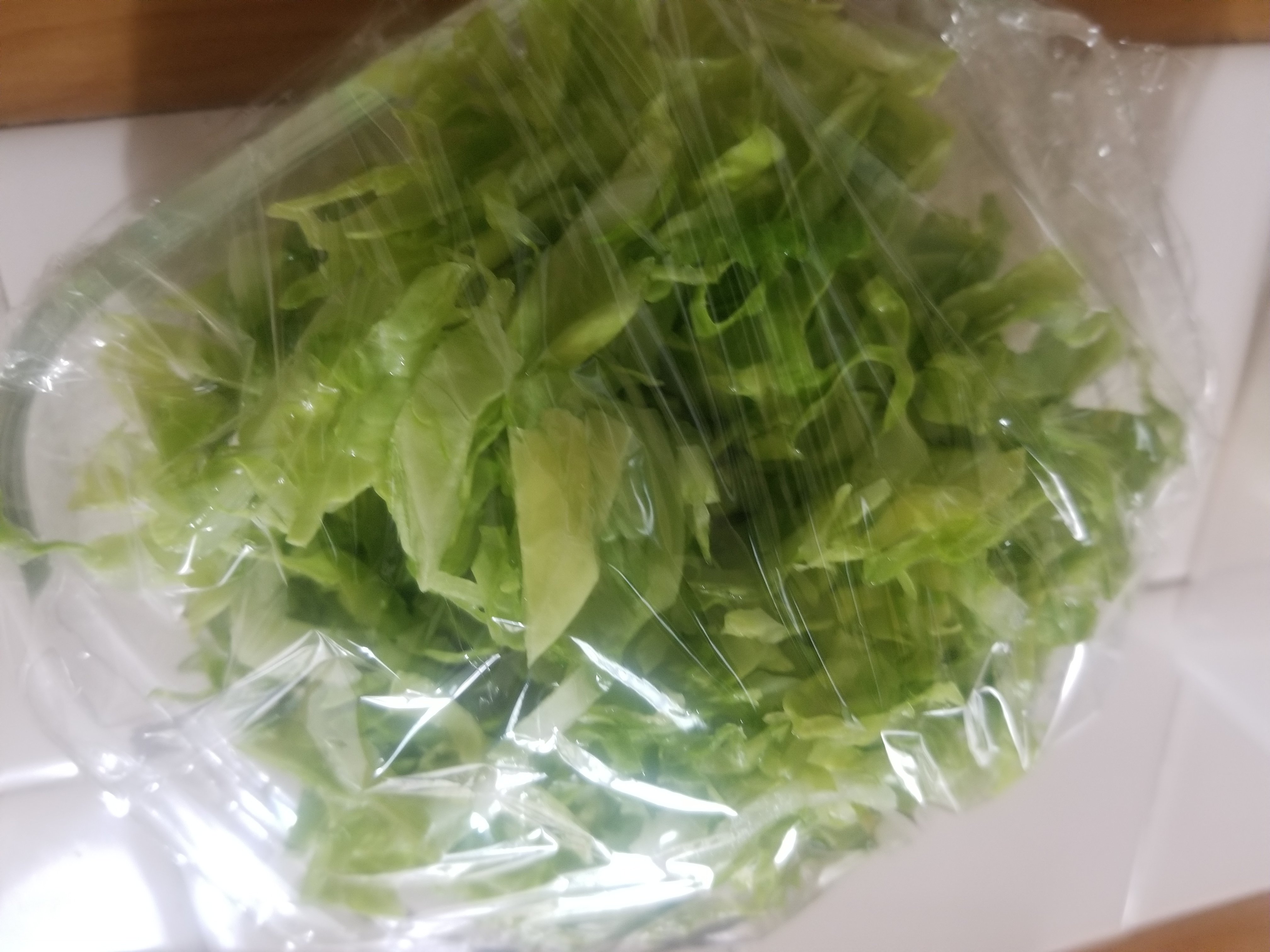 キャベツを千切りにして耐熱容器に入れ、ラップをかけたら1分レンジにかけます。