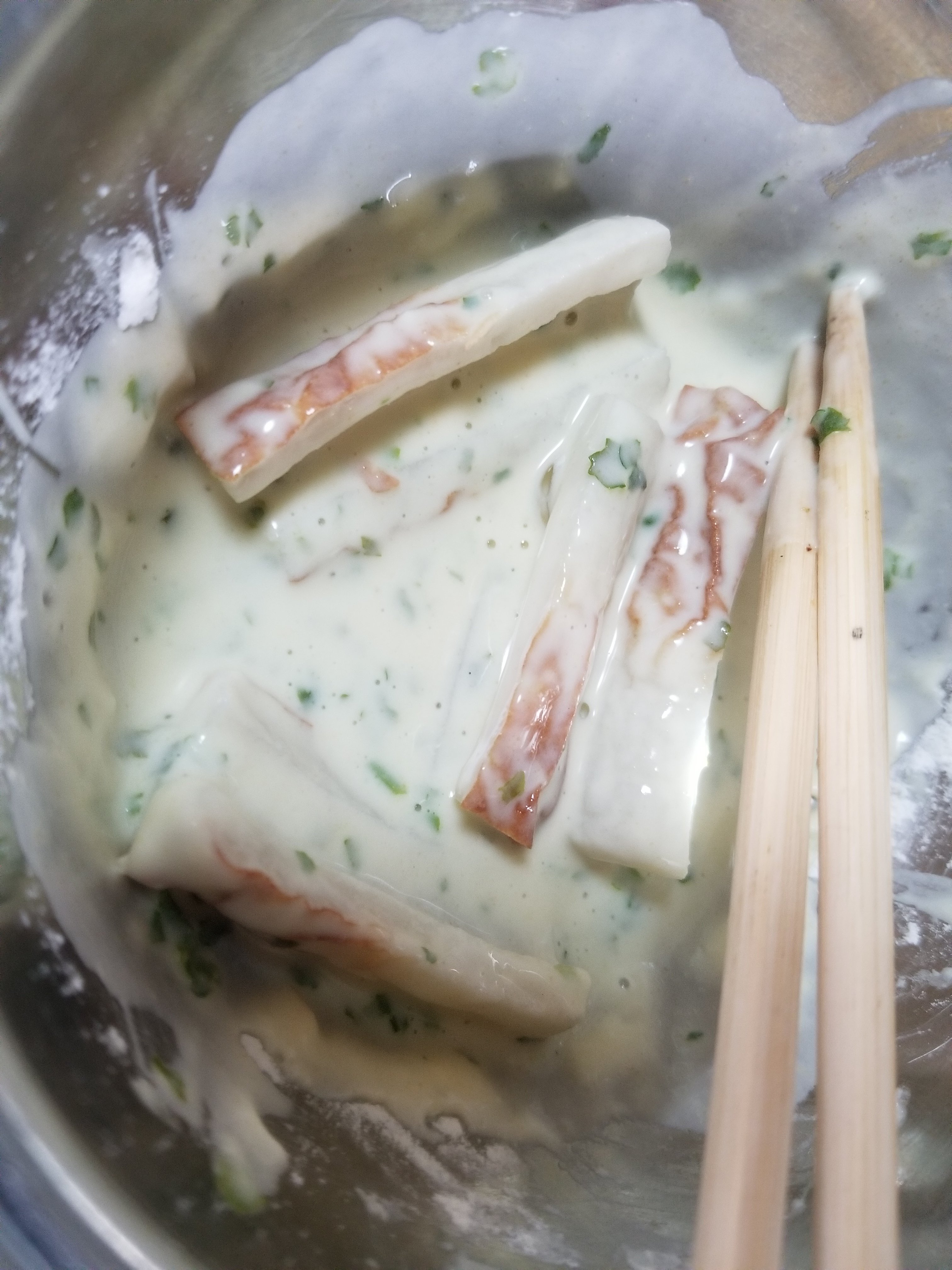 ※衣は白身フライに使ったてんぷら粉の残りを使います