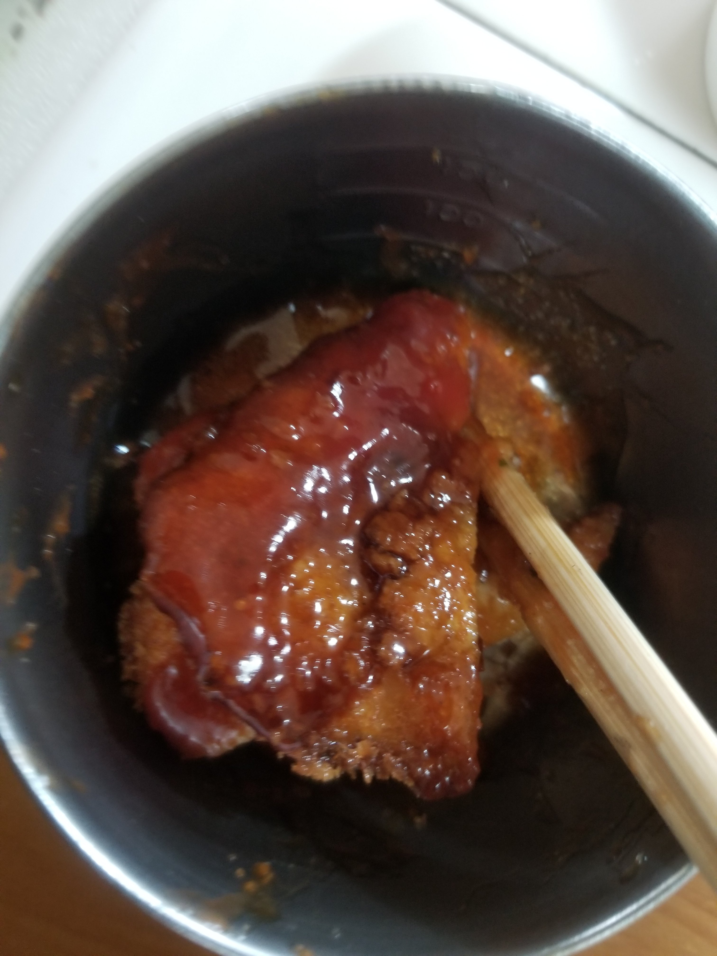 しっかり油が切れたら、ケチャップ、中濃ソースに砂糖を混ぜたソースをからめます。