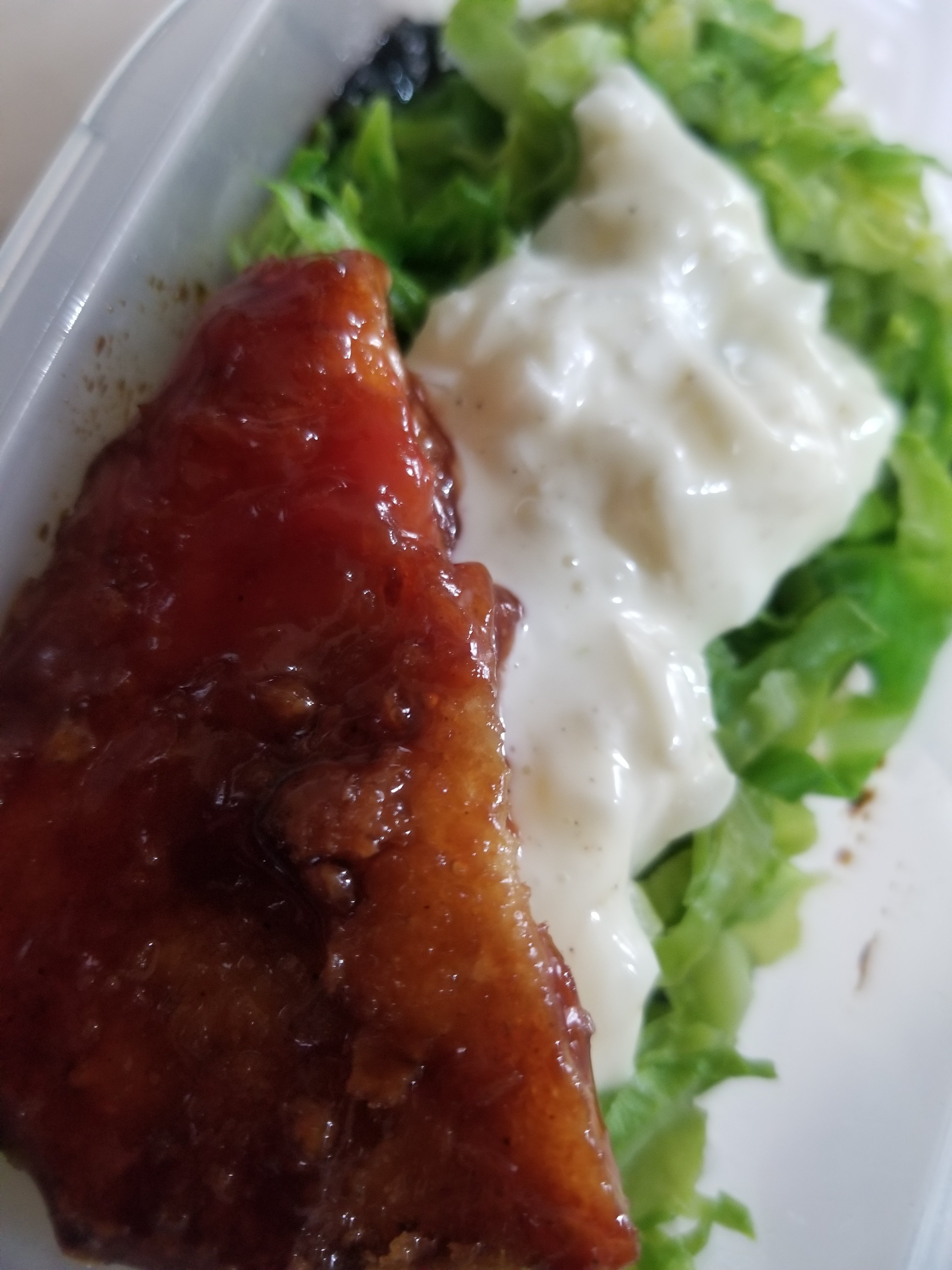 そのうえにキャベツを敷き詰め、タルタルソースをおいて、そのうえに白身フライとちくわをのせます。