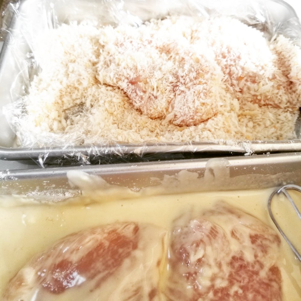 千切りキャベツとカツを盛りつけて出来上がりです。