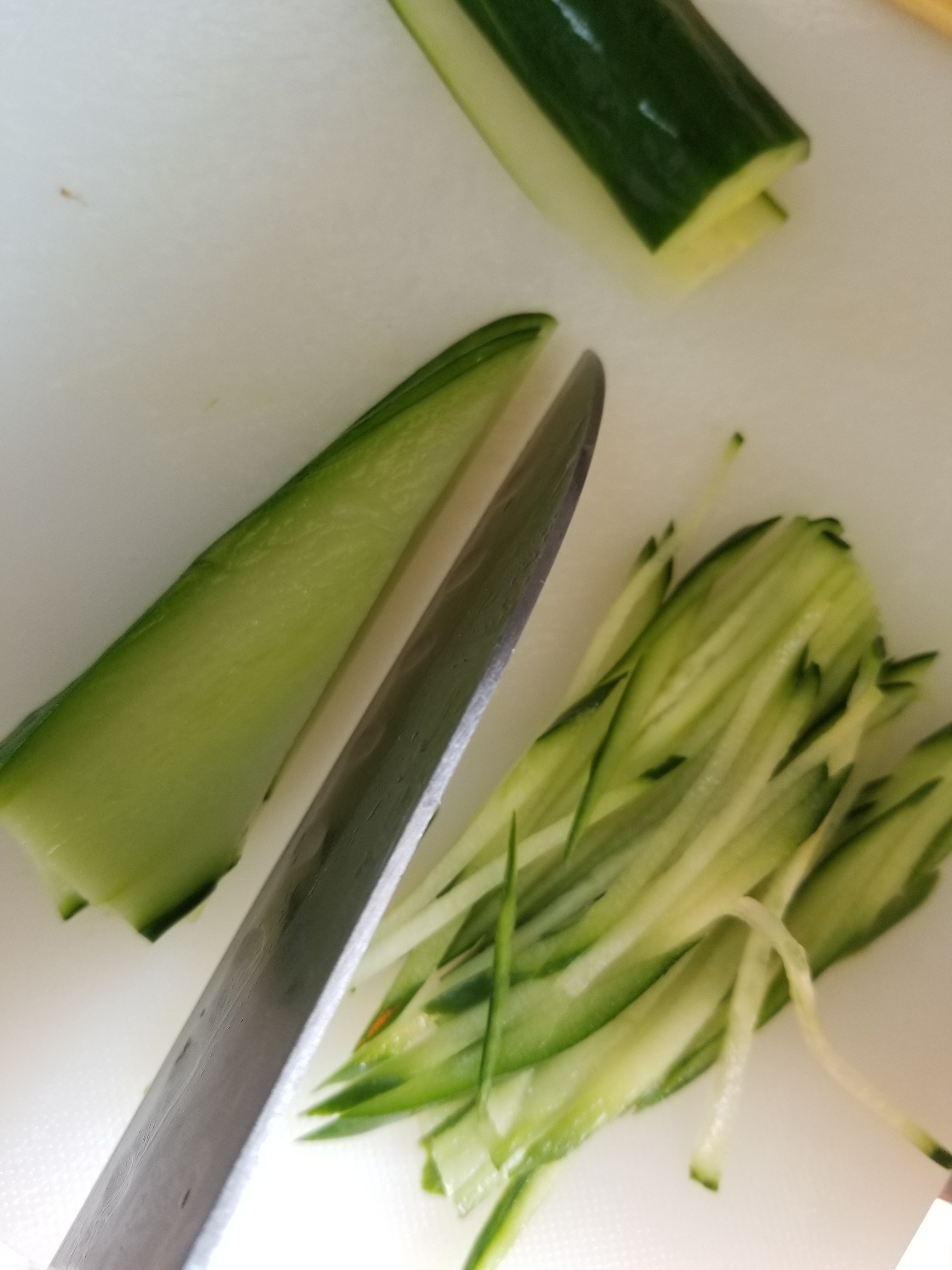 斜めに包丁を入れることで細切りの両端に皮の濃い緑が模様のように残ります。