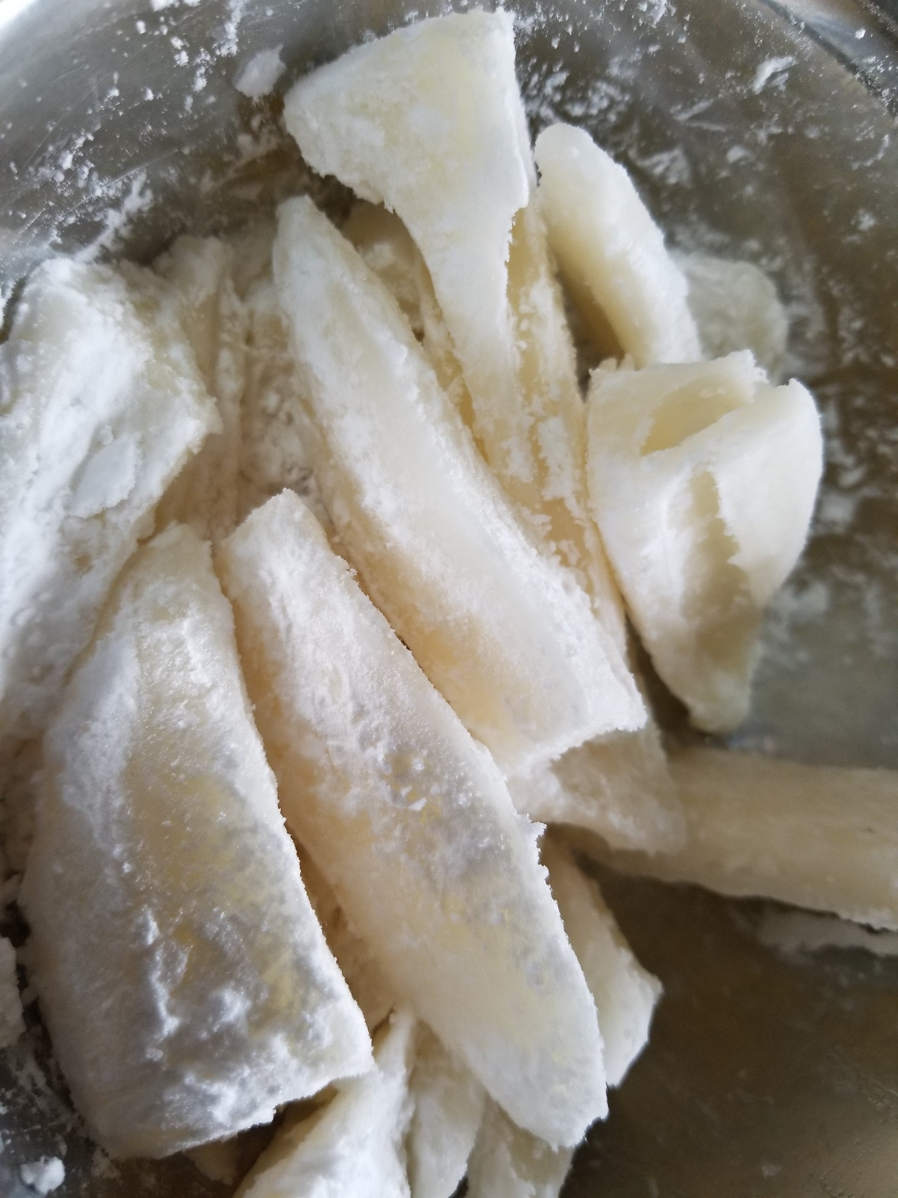 水気をよく拭いたら片栗粉をしっかりまぶします。