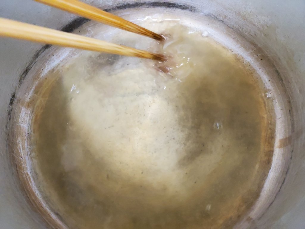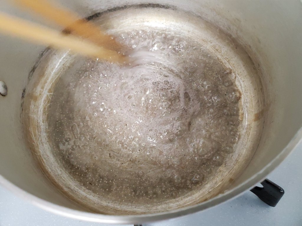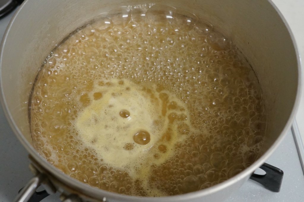 まず最初に水と砂糖を鍋に入れてまぜながら
