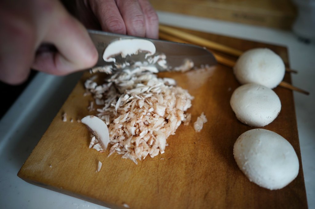 マッシュルーム、にんにく、玉ねぎをみじん切りにして