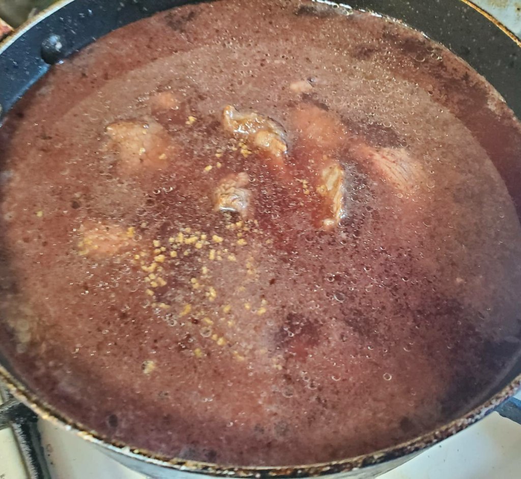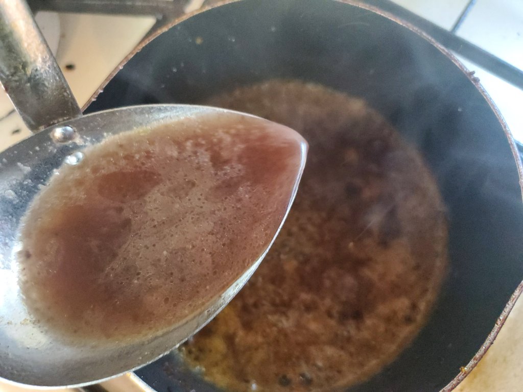 赤ワインを入れてうまみをこそぎ、