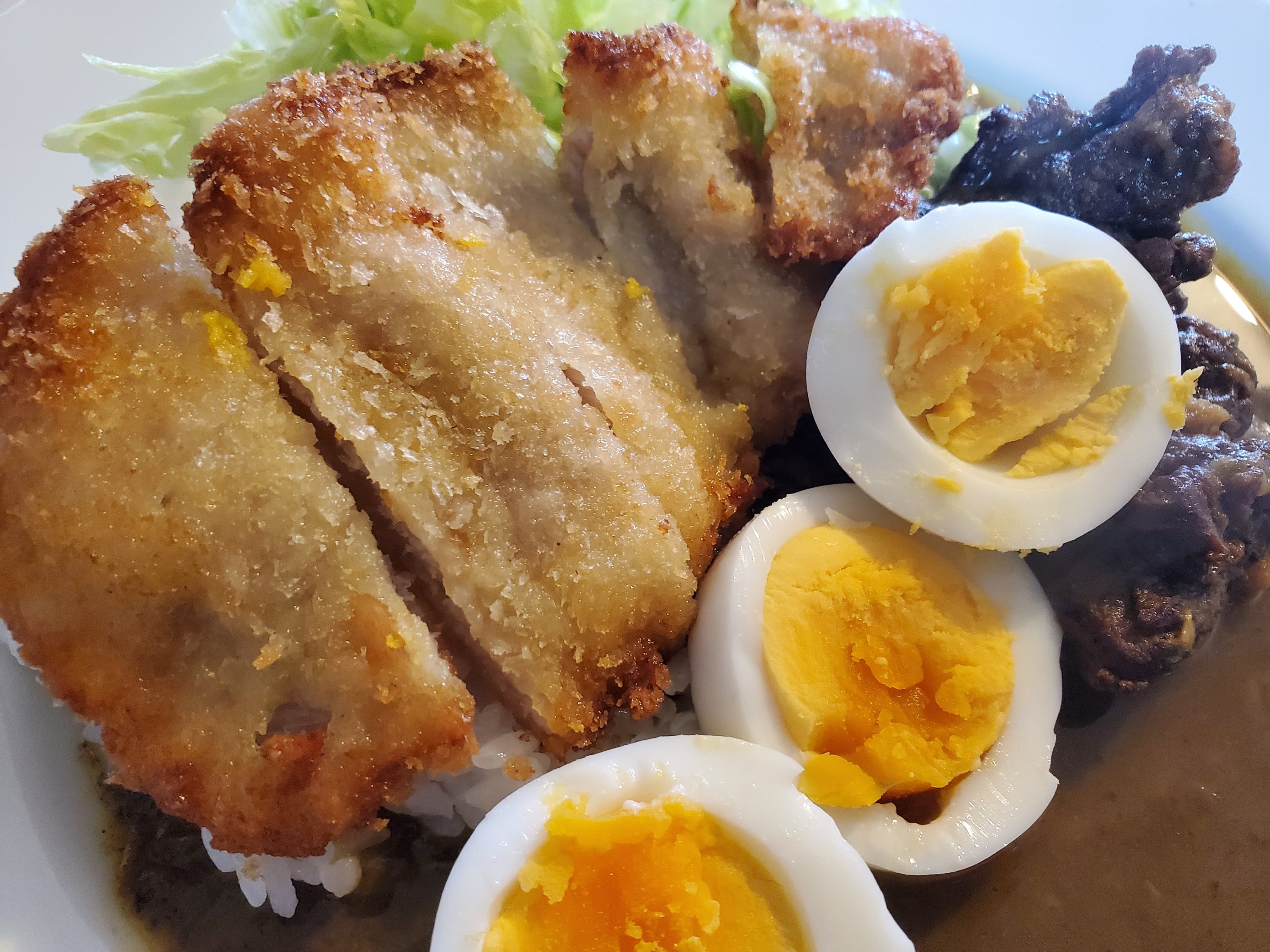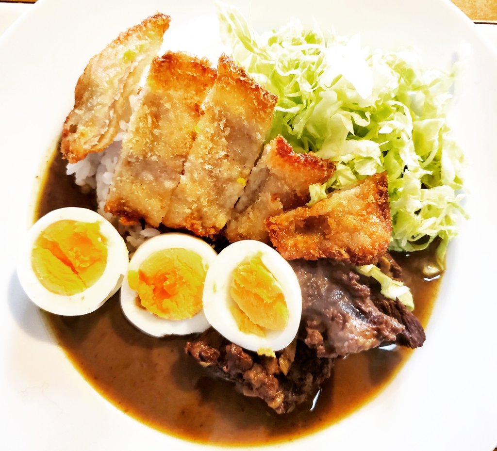 トケイヤkitchen定番人気のレシピ、さらっとした口当たりのルウを使用しないタイプのビーフカレーに、美明豚のロースをクリスピーに揚げたカツをのせて豪華に頂く一皿です🍛