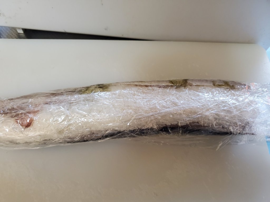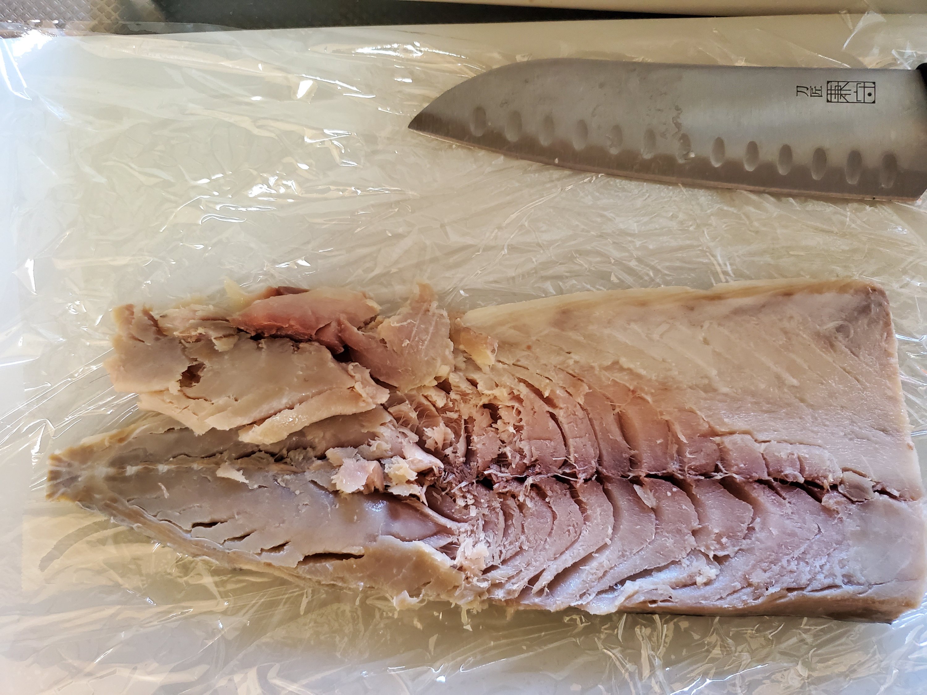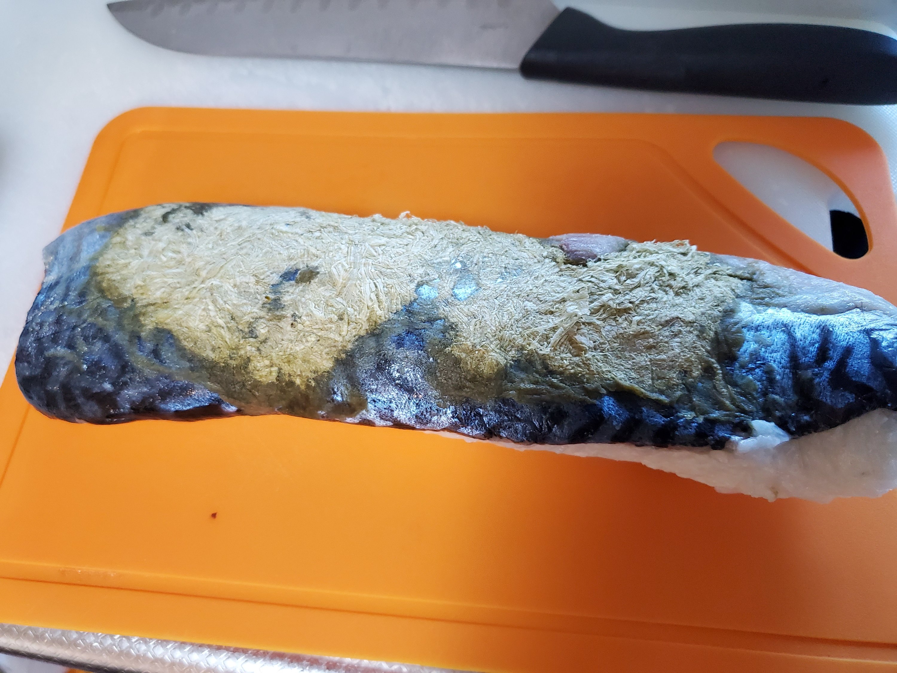 地元ではこの季節になると、「きずし」用の生鯖が売っているので、〆鯖を作るところから始めるのですが、こちらではなかなか生の鯖はないので、〆鯖を買いました。