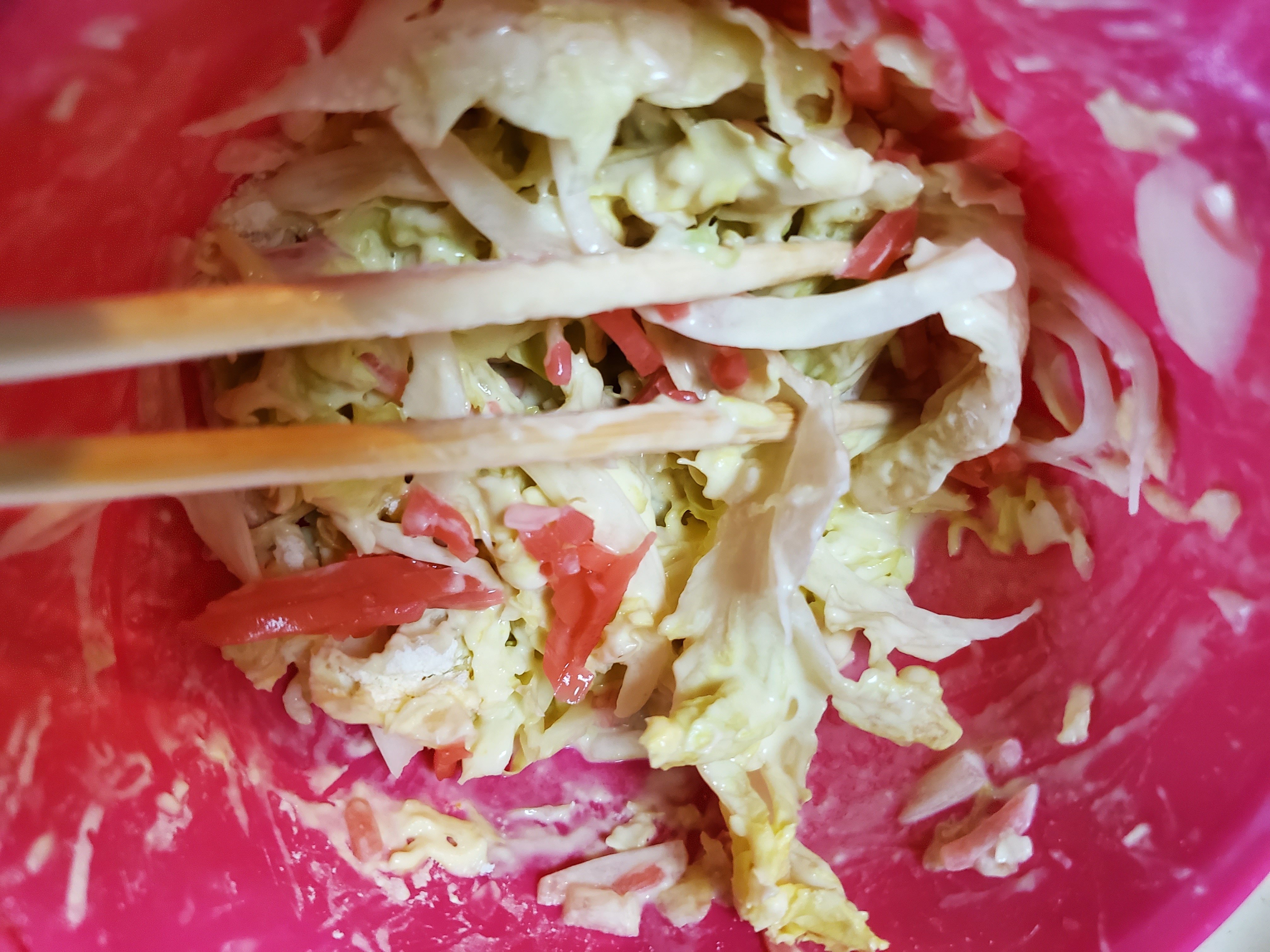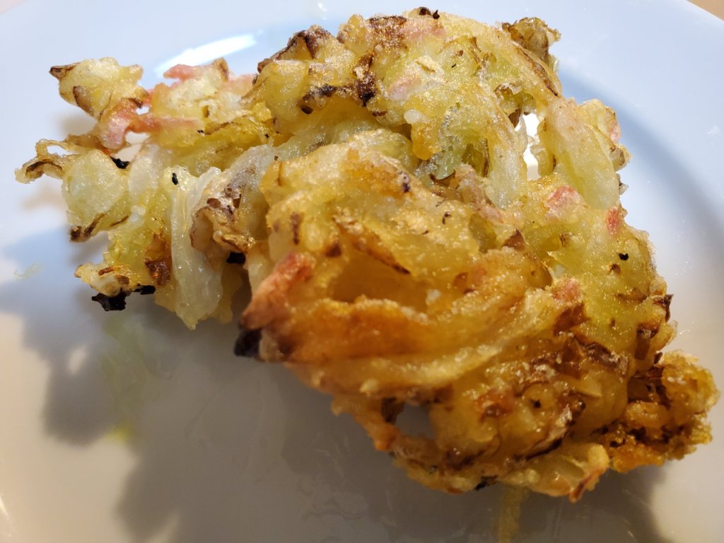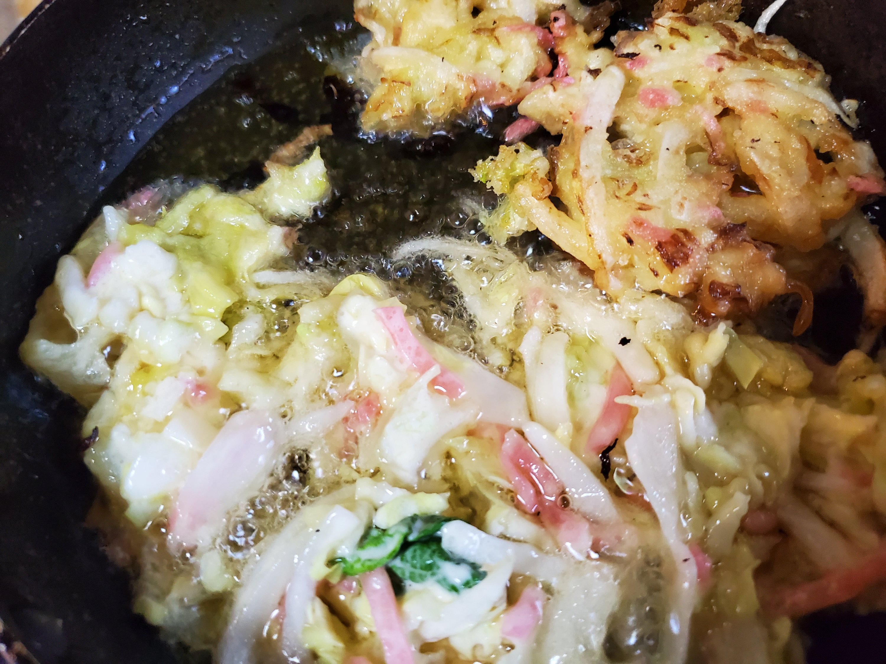 春キャベツと新玉ねぎと紅しょうがをひとつにまとめたかき揚げです。