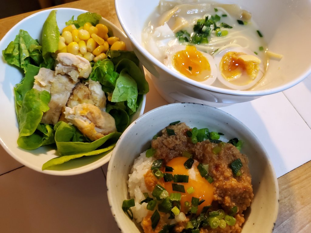 唐揚げサラダに、とんこつ半ラーメン(味玉のせ…卵がかぶってますね)