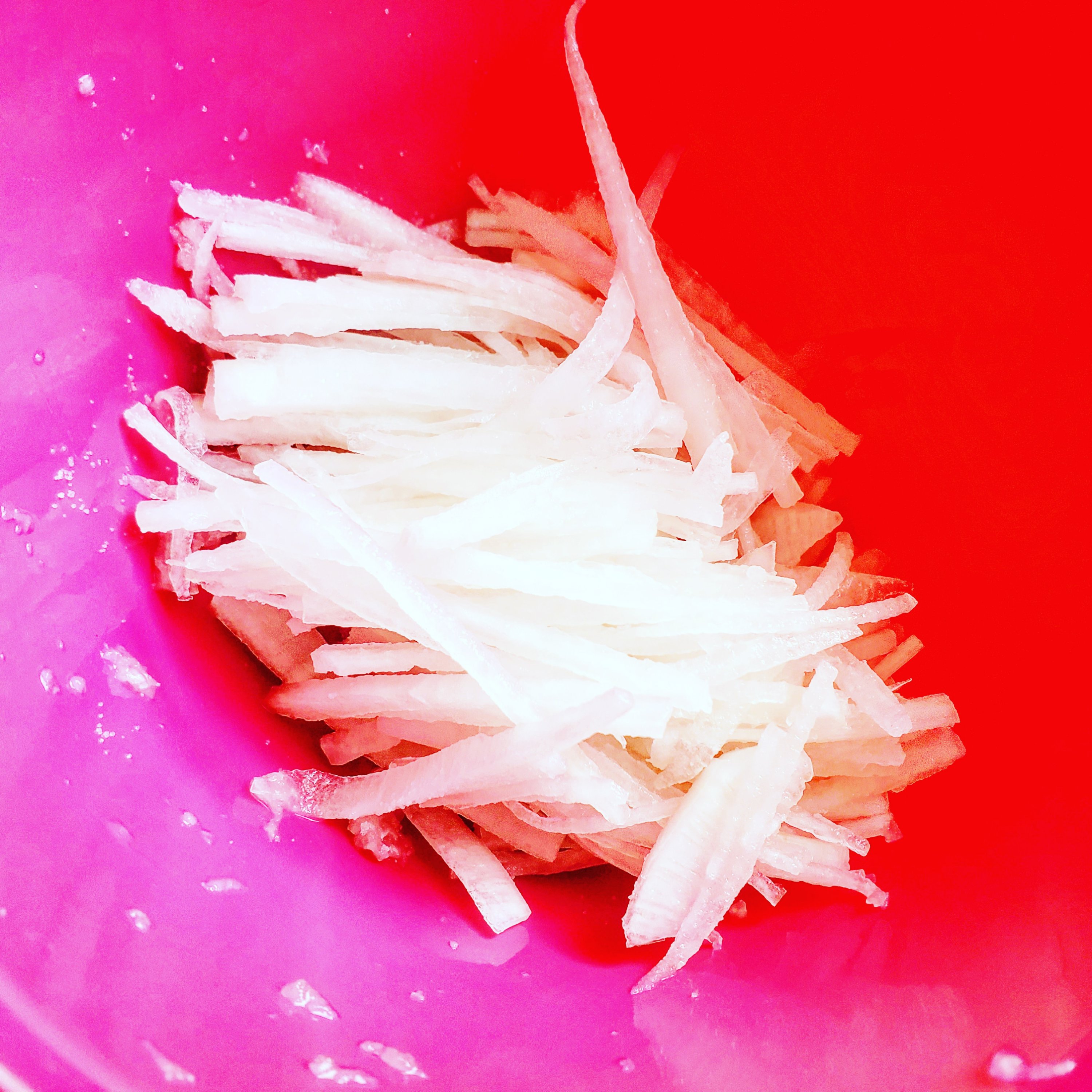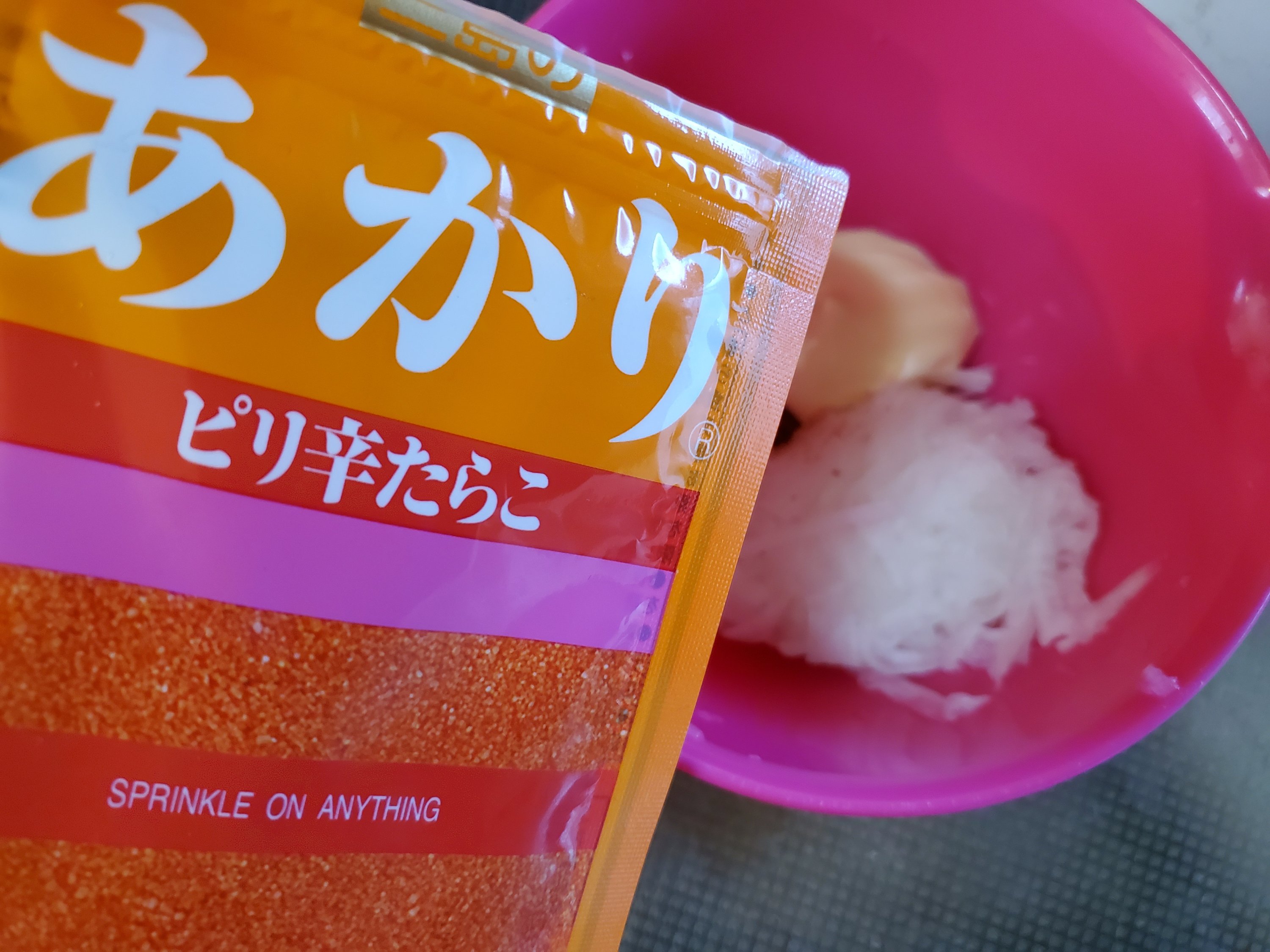 純白の大根に、ピンクのたらこふりかけがキレイです。