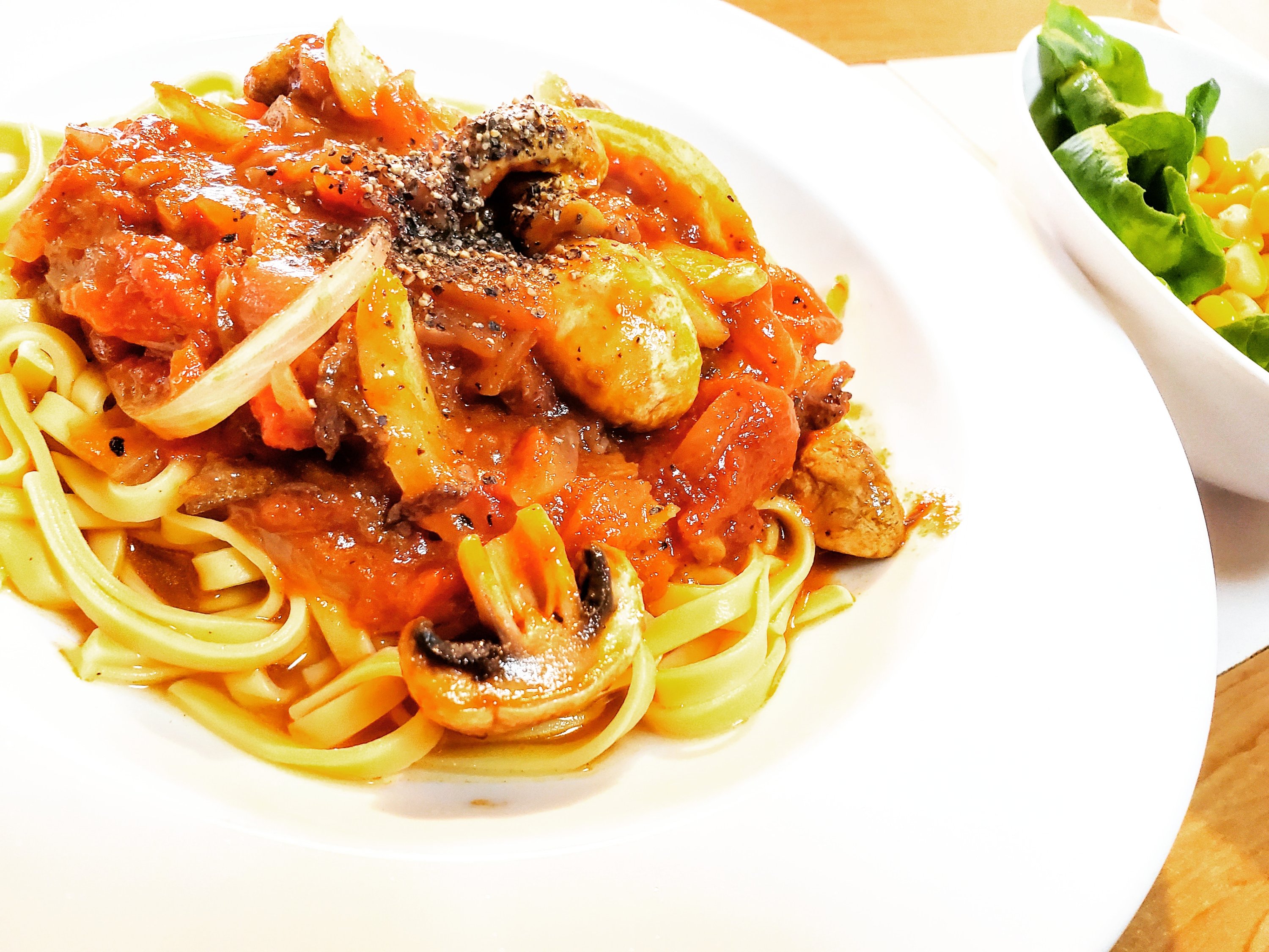 アルデンテに仕上げたフェットチーネとマッシュルームで味に深みを出したミートソース、美味しいですね。